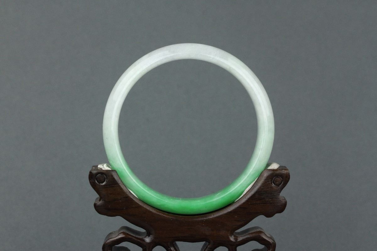 Chinese jadeite bangle; rounded outside and flatten inside; of white and apple green tone; D: 7 cm, Inner D: 6 cm, 42 grams; Density: 3.26