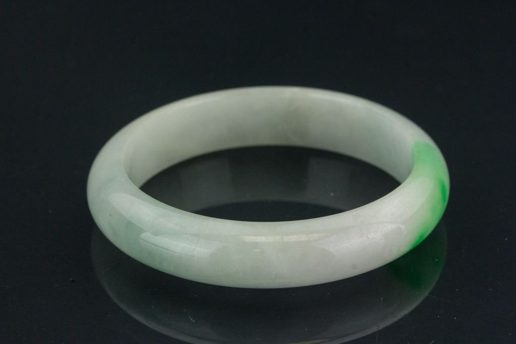 Chinese greed jade bangle; rounded outside and flatten inside; of pale green tone with tinge of apple green; Thickness: 2.2 cm, D: 6.9 cm, Inner D: 5.7 cm, 47 grams Density: 3.29
