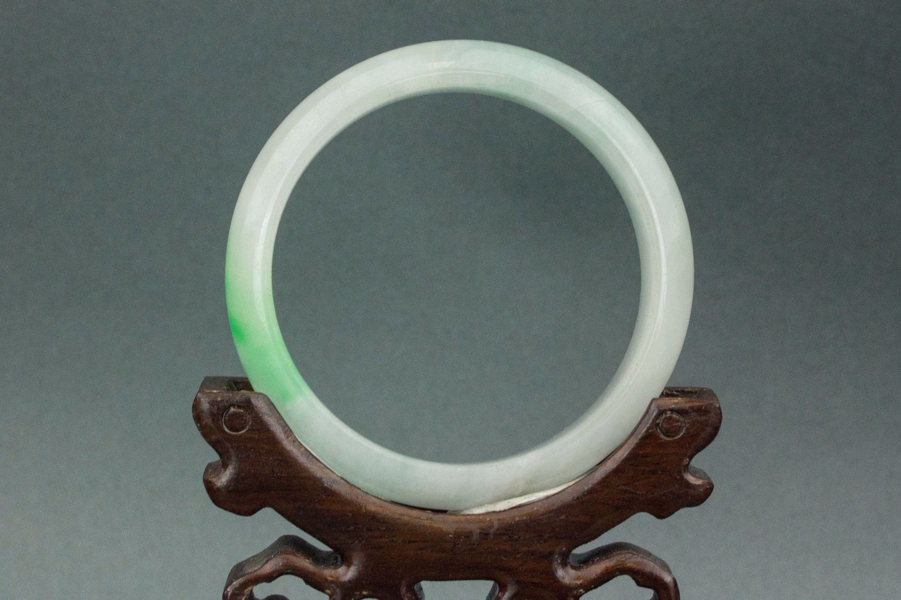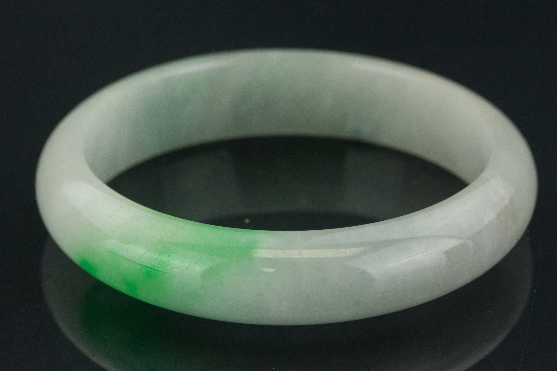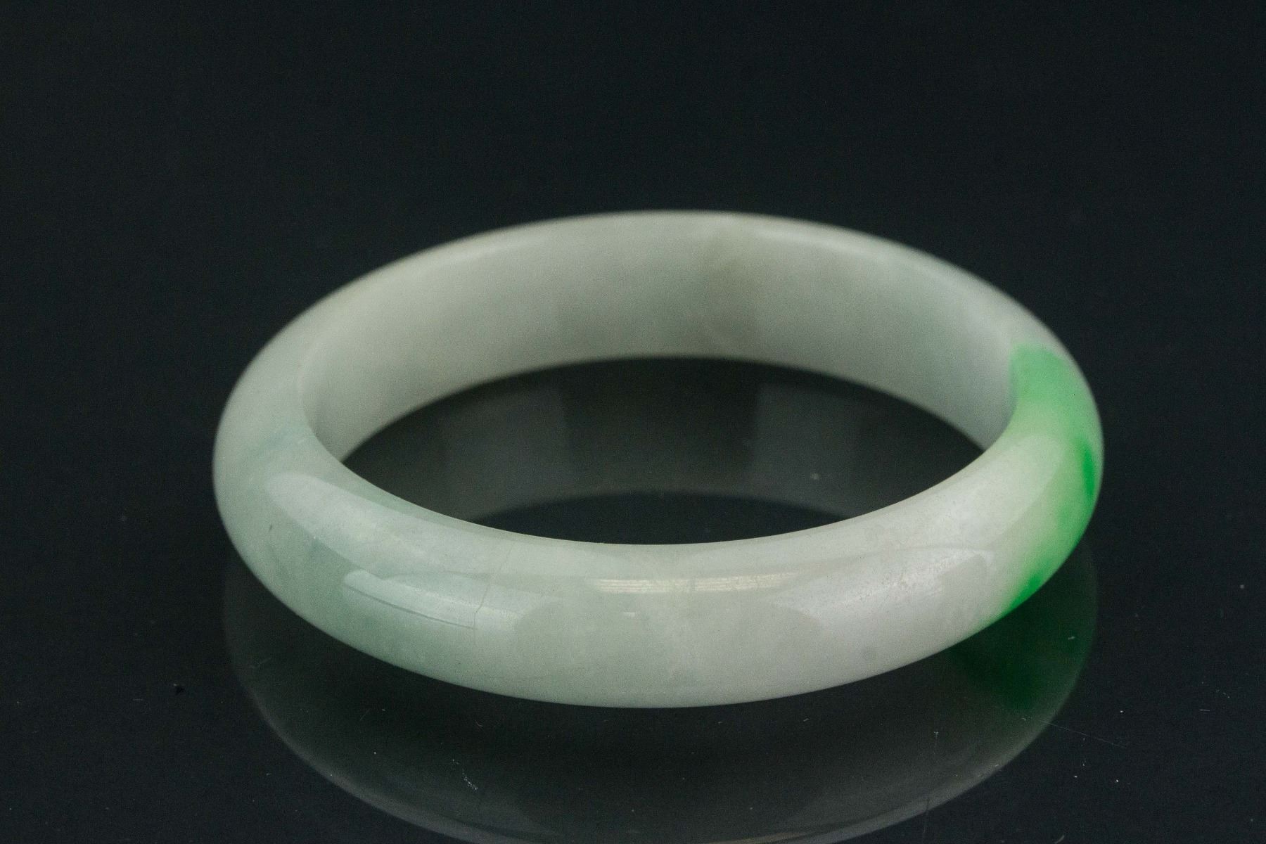 Chinese greed jade bangle; rounded outside and flatten inside; of pale green tone with tinge of apple green; Thickness: 2.2 cm, D: 6.9 cm, Inner D: 5.7 cm, 47 grams Density: 3.29