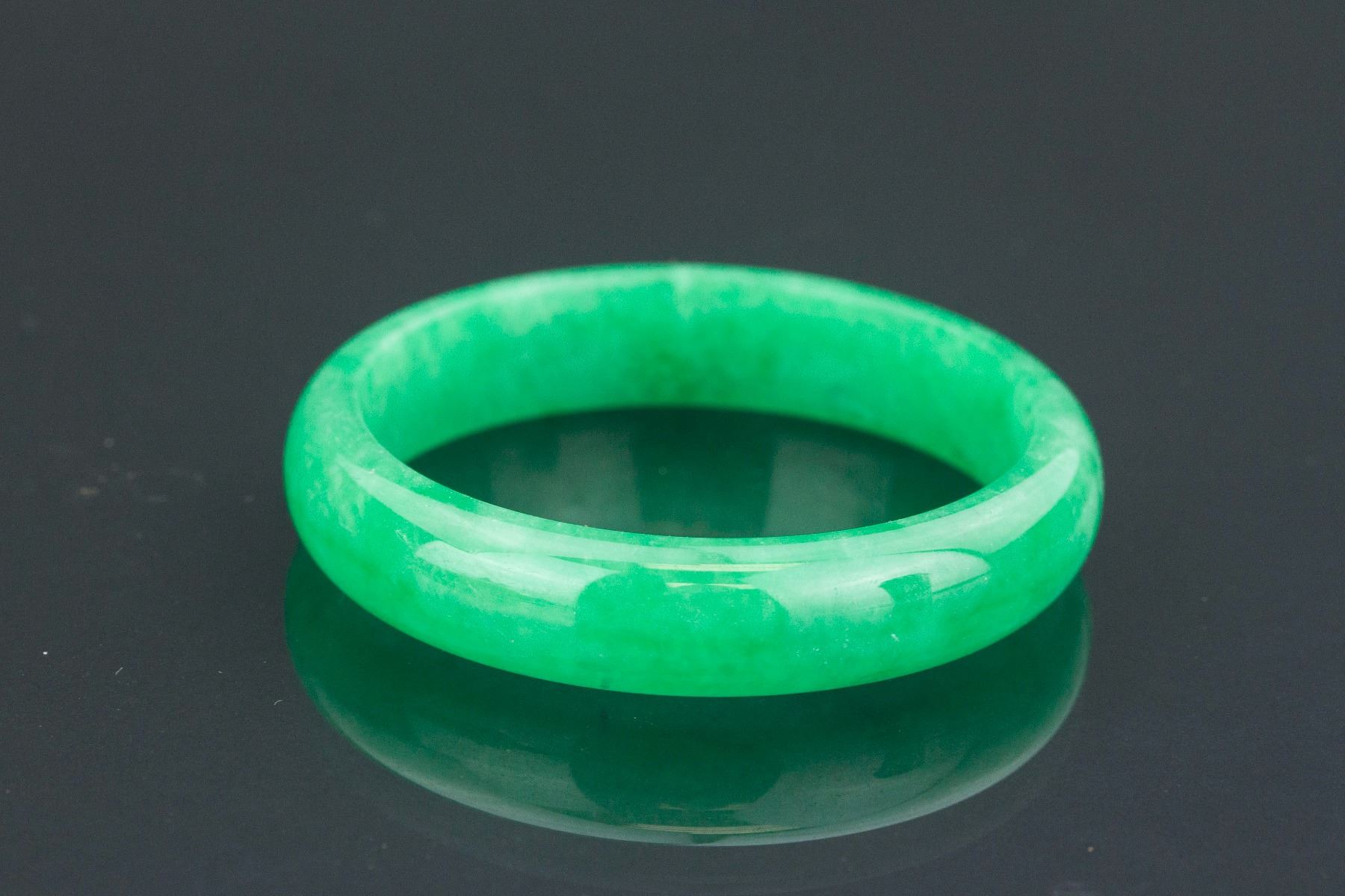 Chinese green jadeite bangle; rounded outside and flatten inside; of green tone; D: 7 cm, Inner D: 5.5 cm, 47 grams, Density: 3.31