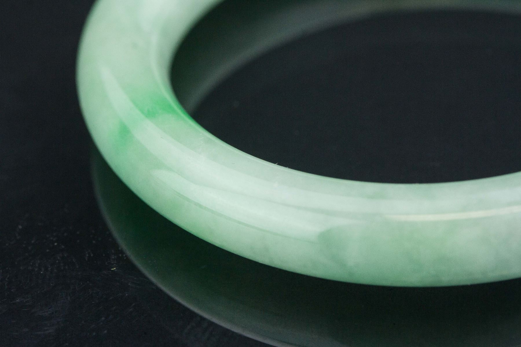 Chinese green jade bangle; of round edge; of pale green tone with apple green suffusions; D: 8 cm, Inner D: 6 cm, 56 grams, Density: 3.21