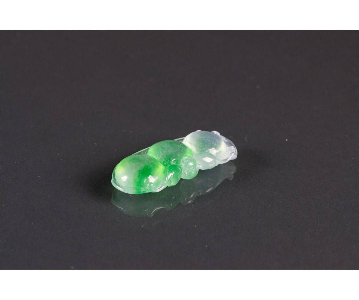 Chinese jadeite carved pendant; featuring three beans and a Fu bat; of translucent emerald green tone; pierced for suspension; H: 5 cm, W: 2.2 cm, 15 grams