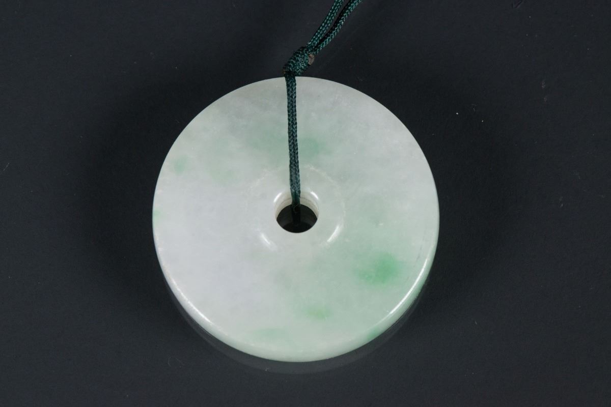 Chinese jadeite pendant; of Bi disk form; of apple green tone with emerald green suffusion; D: 6 cm, 82 grams, Density: 3.28