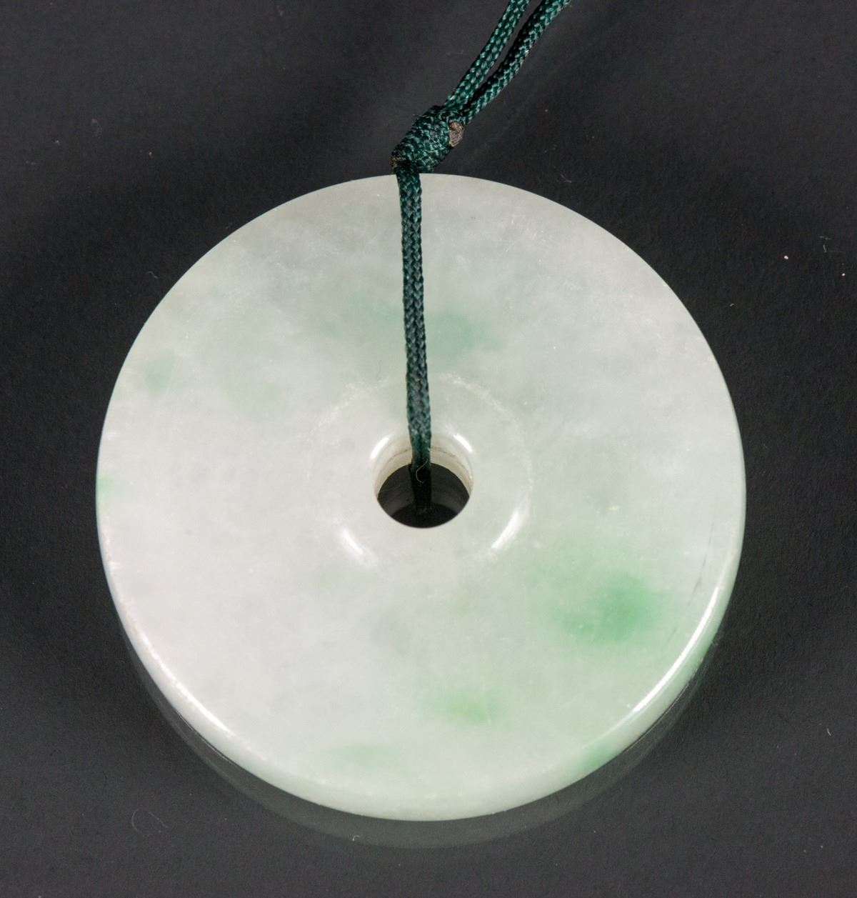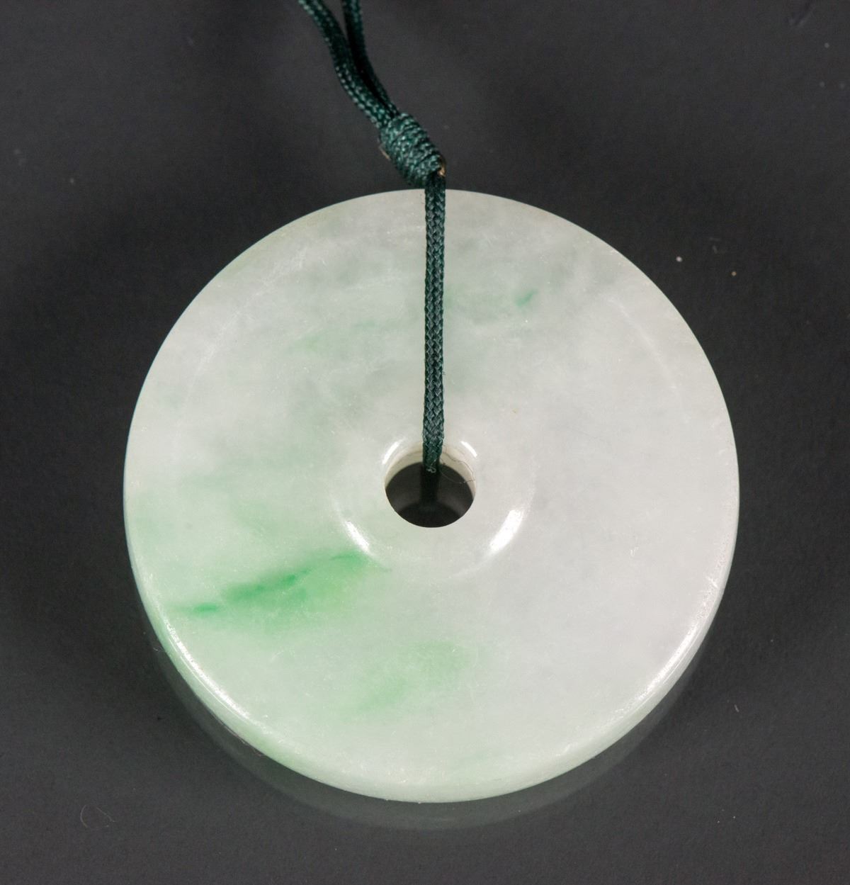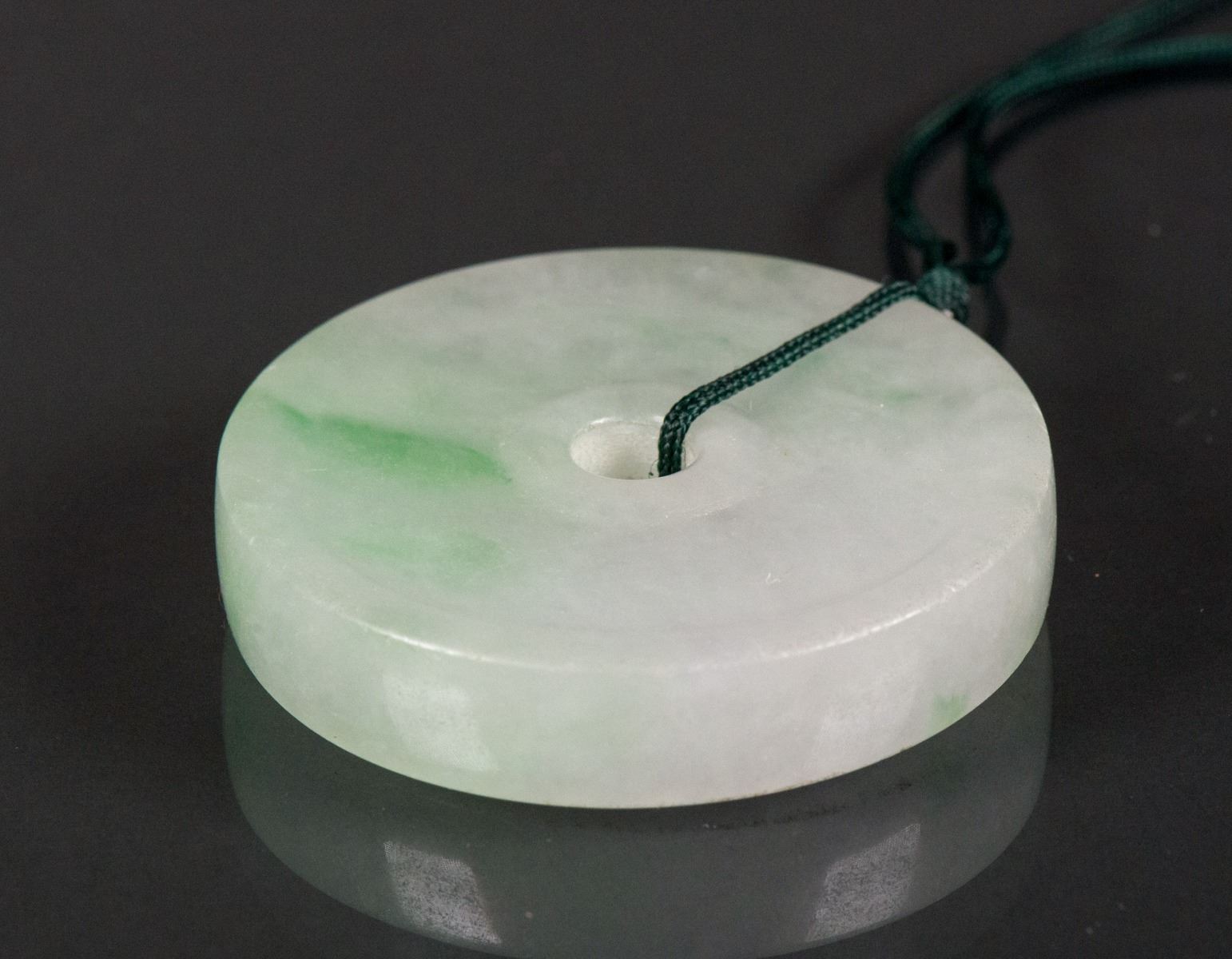 Chinese jadeite pendant; of Bi disk form; of apple green tone with emerald green suffusion; D: 6 cm, 82 grams, Density: 3.28