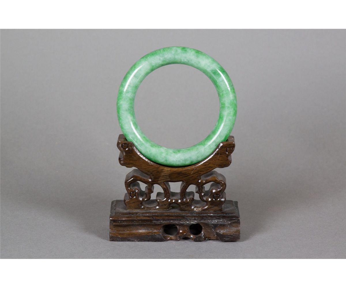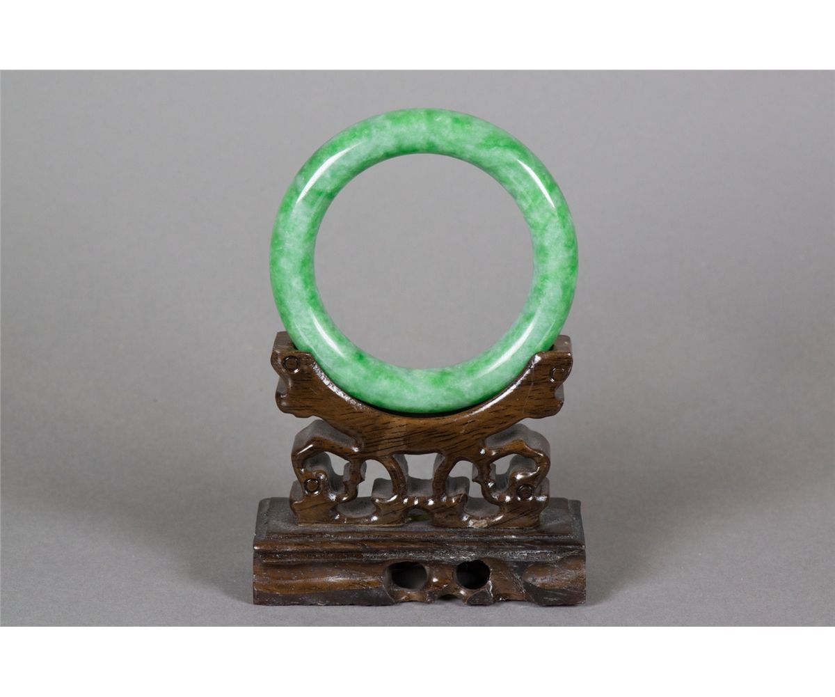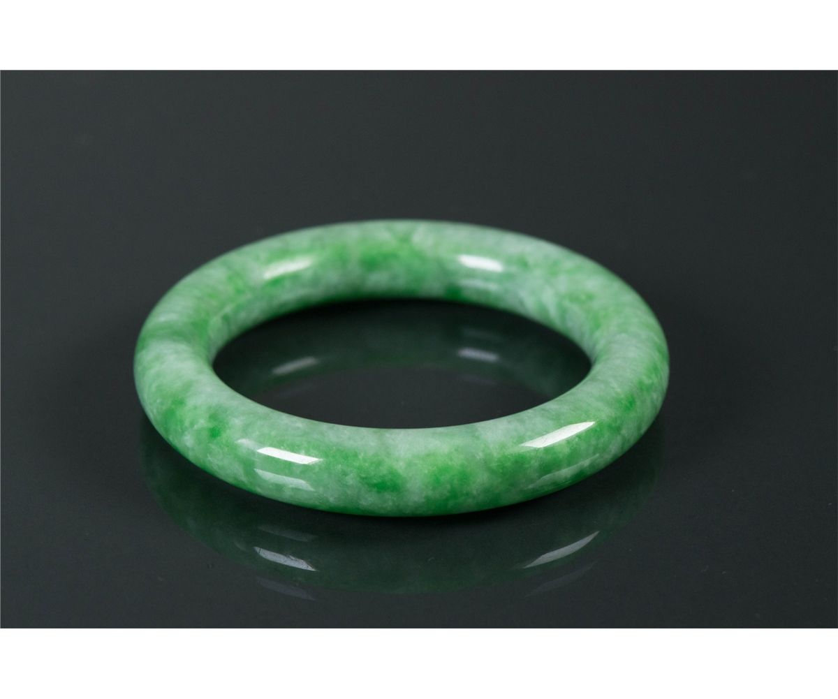 Chinese green jadeite carved bangle; of rounded edge; of apple green tone; D: 8 cm, Inner D: 6 cm, 84 grams Density 3.30