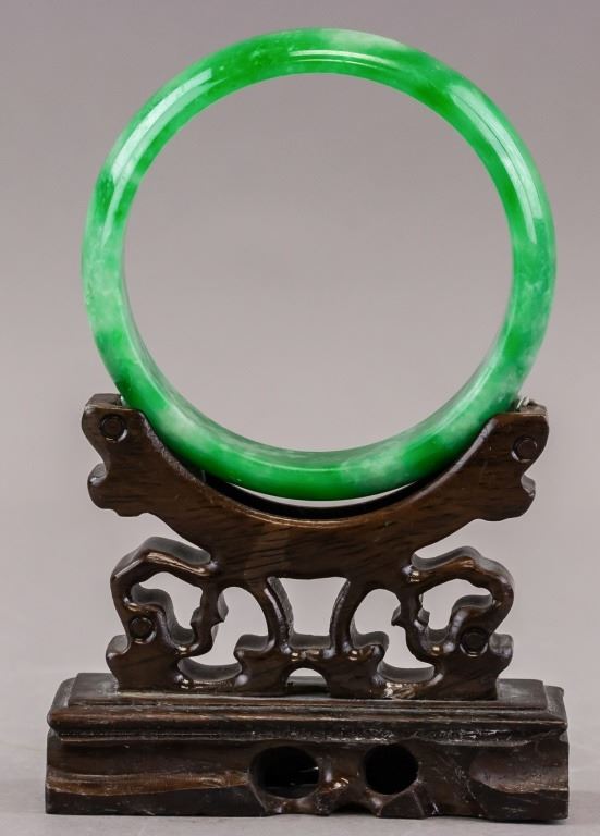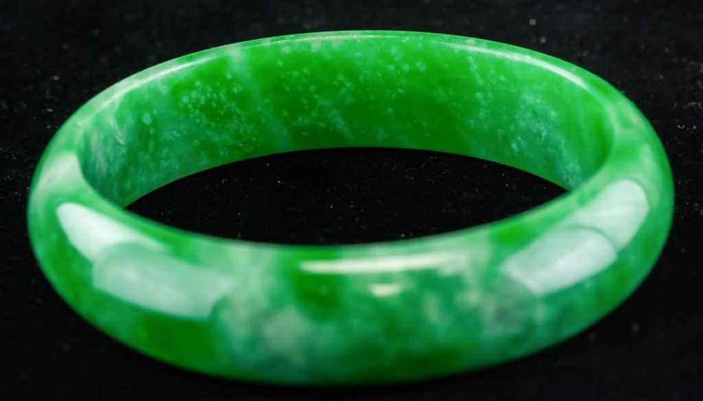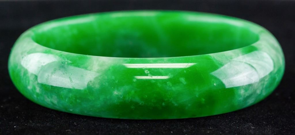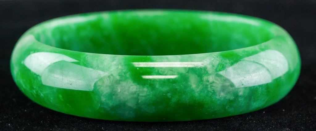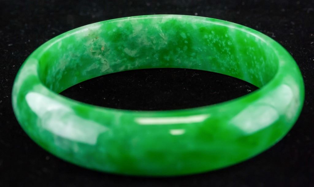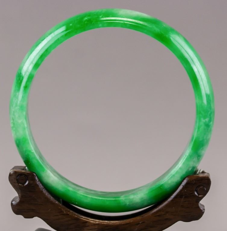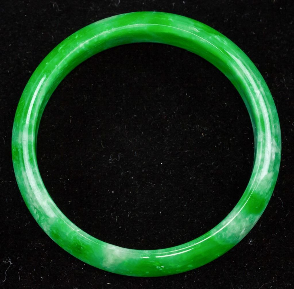 Chinese jadeite bangle. Of green tone with cloudy inclusions. Of flat inside and rounded inside. Inner diameter: 6.5 cm. Outer diameter: 8 cm. 72 grams.