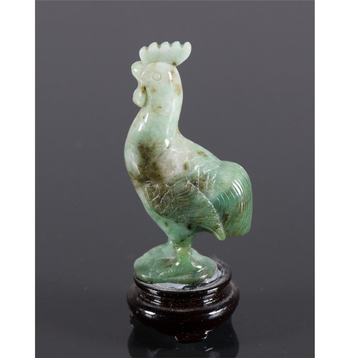 Chinese green jadeite carved figure; depicting a rooster; of white tone with spinach green mottle; wood stand included; H: 8 cm, W: 4 cm, 61 grams with stand, density: 3.29