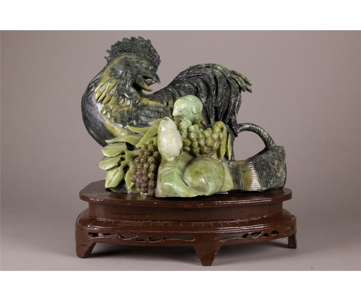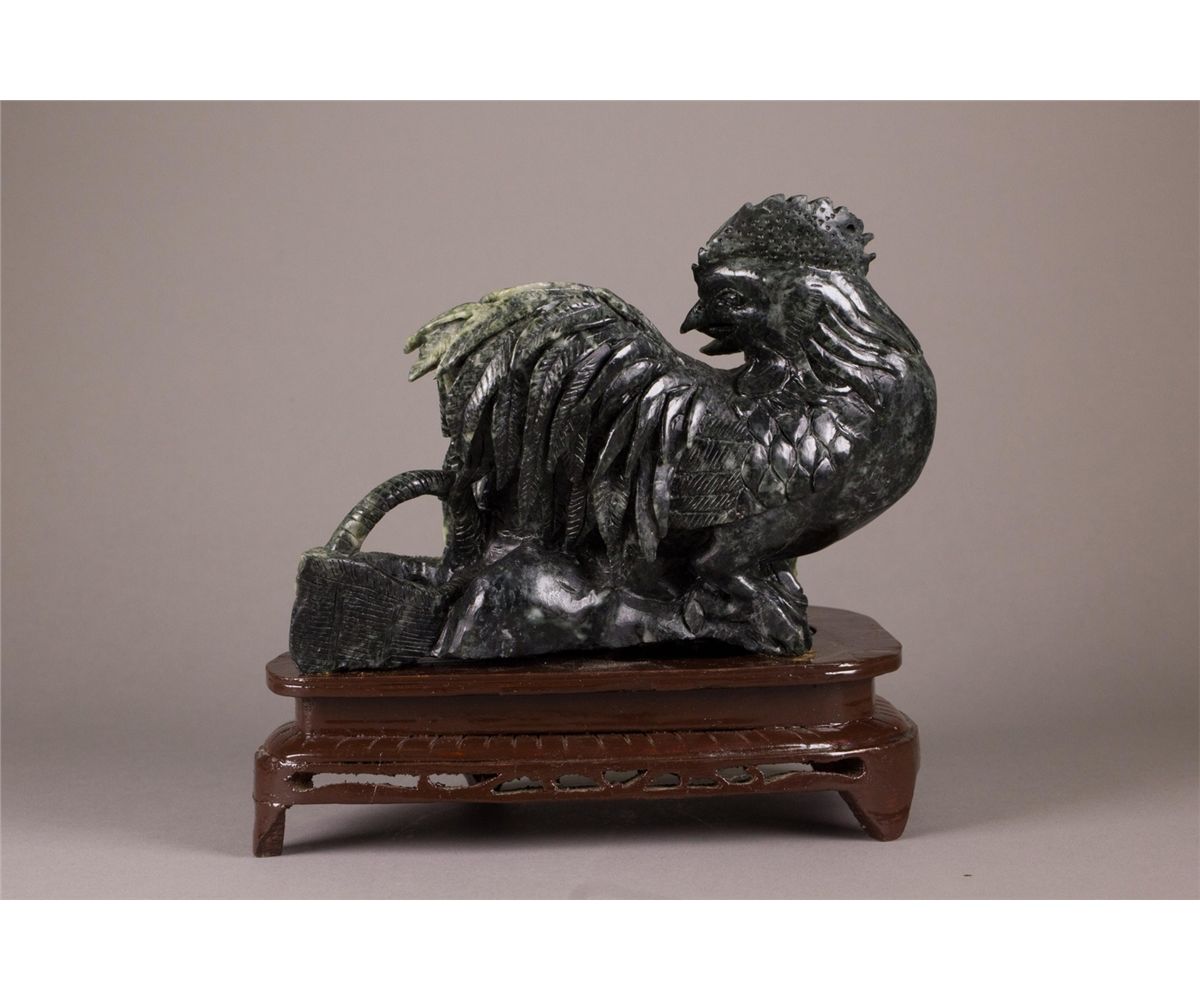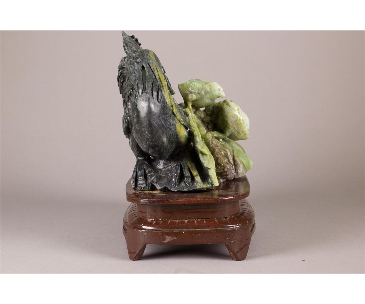Chinese green jadeite carved chicken; featuring a chicken with two chicks; of spinach green tone; custom wood stand included; H: 15 cm, W: 20 cm, 2337 grams