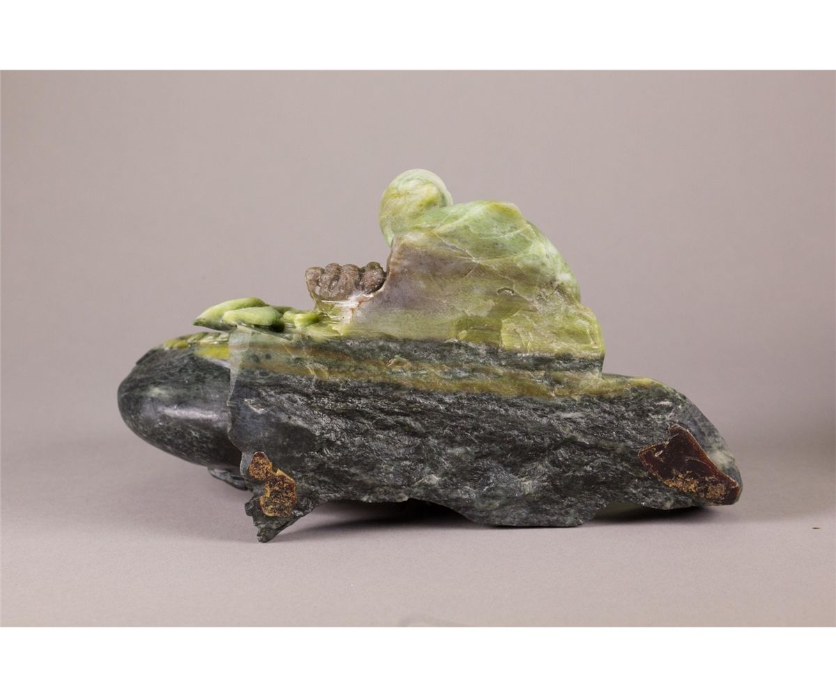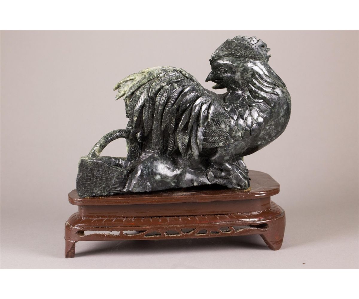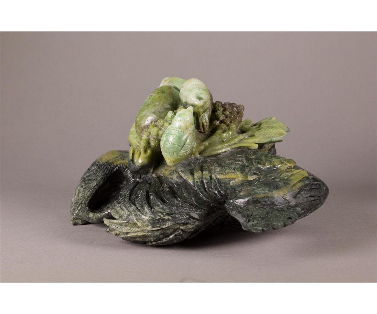 Chinese green jadeite carved chicken; featuring a chicken with two chicks; of spinach green tone; custom wood stand included; H: 15 cm, W: 20 cm, 2337 grams