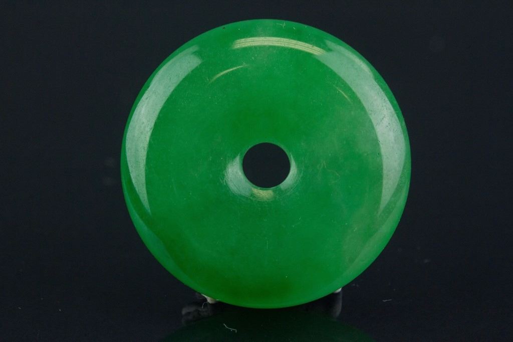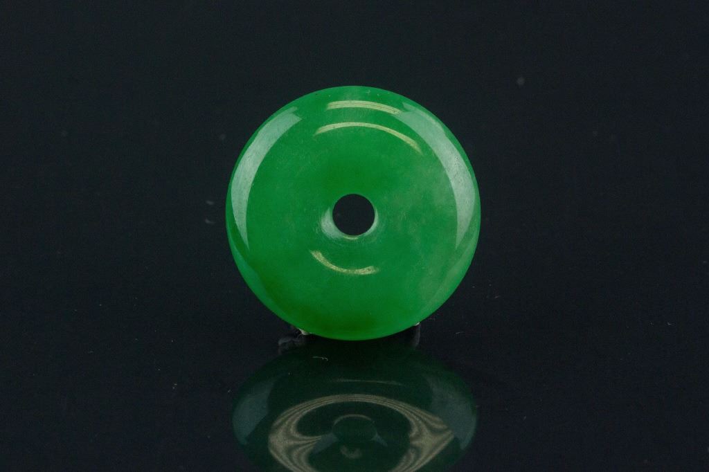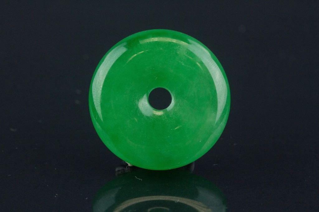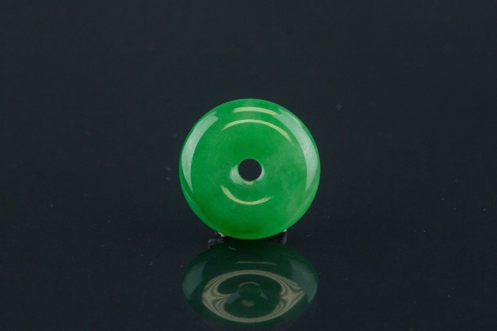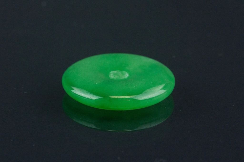 Chinese green jadeite disc pendant; in form of a lucky buckle; the stone of emerald green tone; D: 3 cm, 5 grams, Density: 3.35