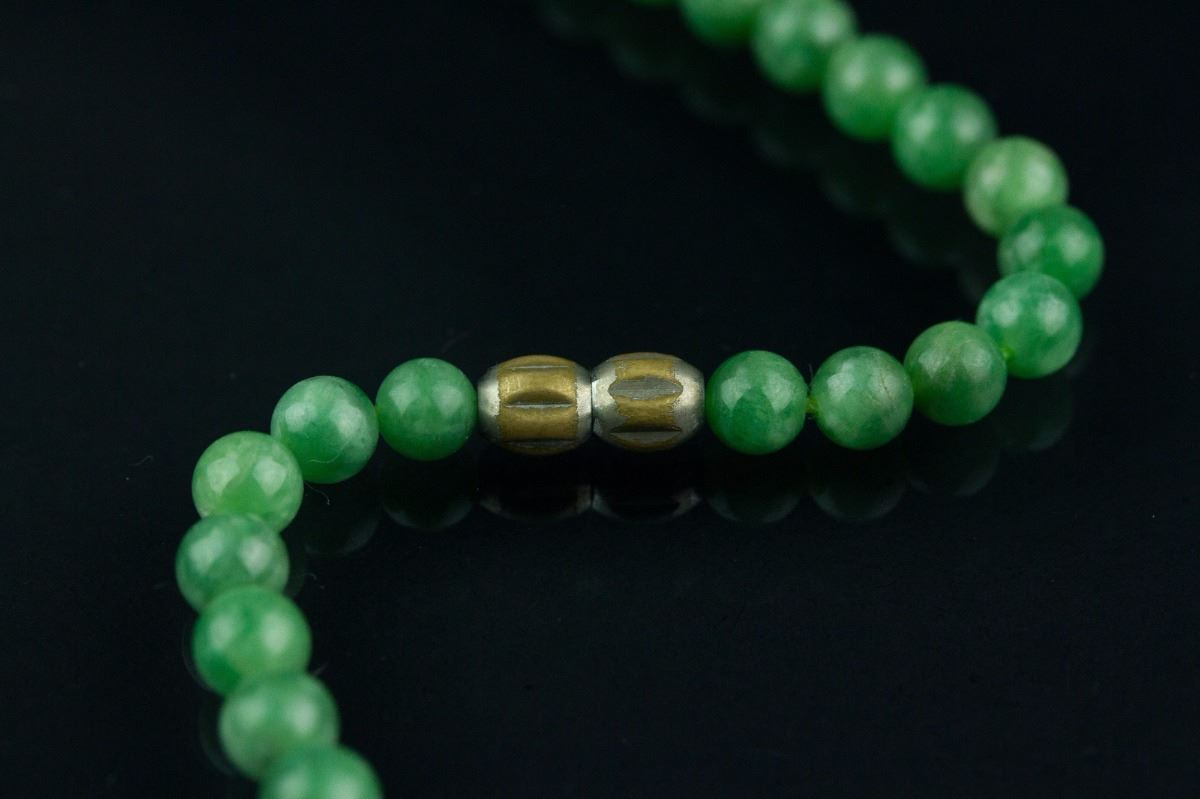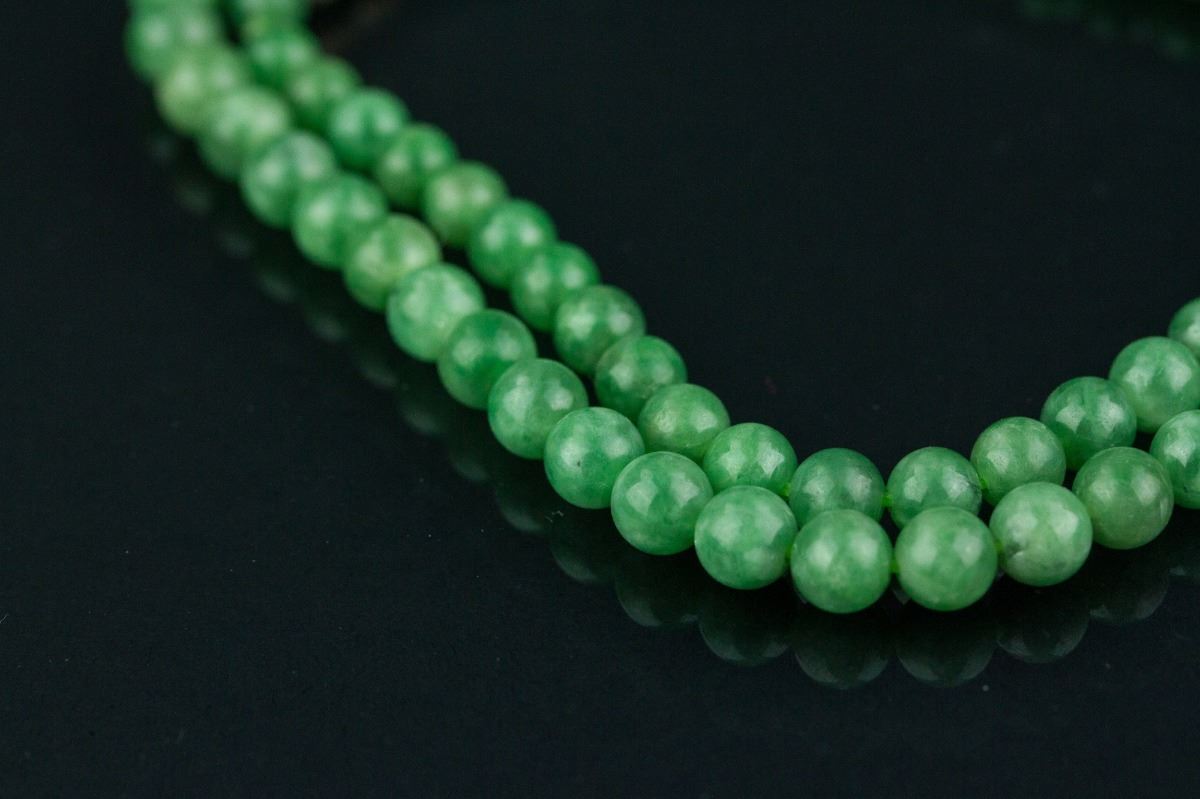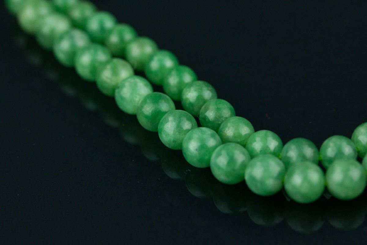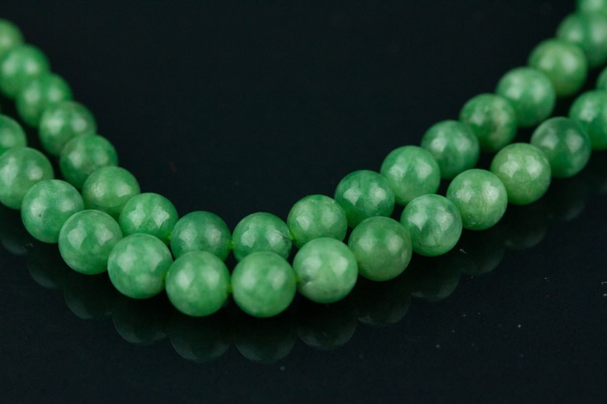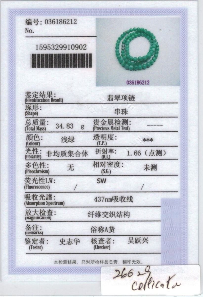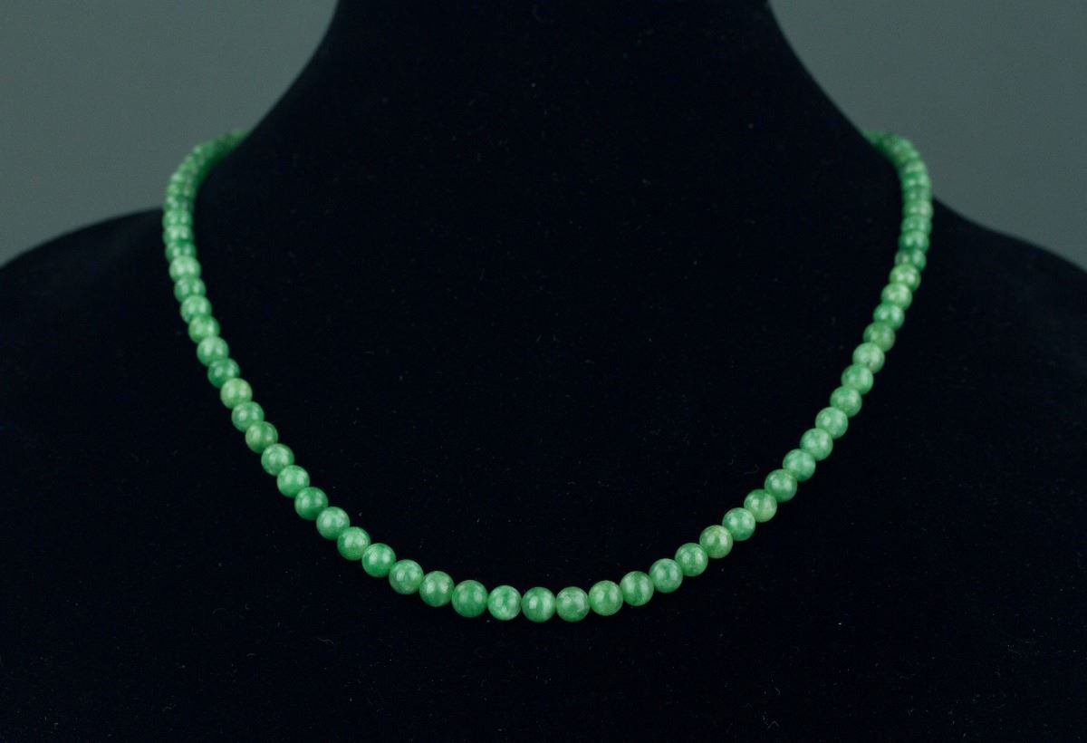 Chinese green jadeite necklace with clasp; comprised of rounded emerald green jadeite beads; accompanied with Grade A jadeite certificate; D: 16 cm, 34 grams, Density: 3.3