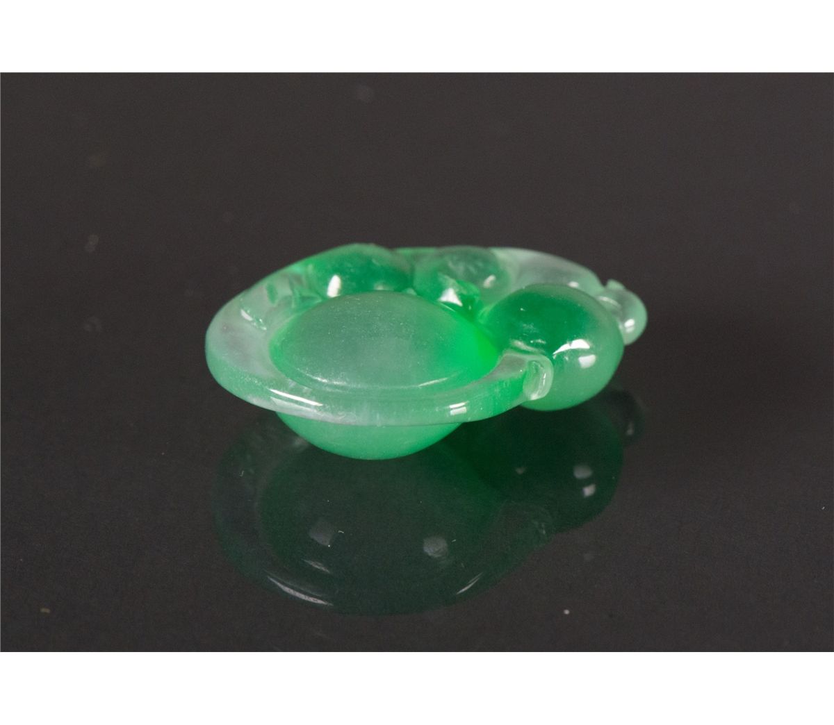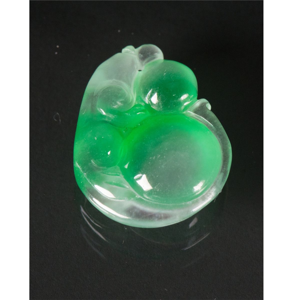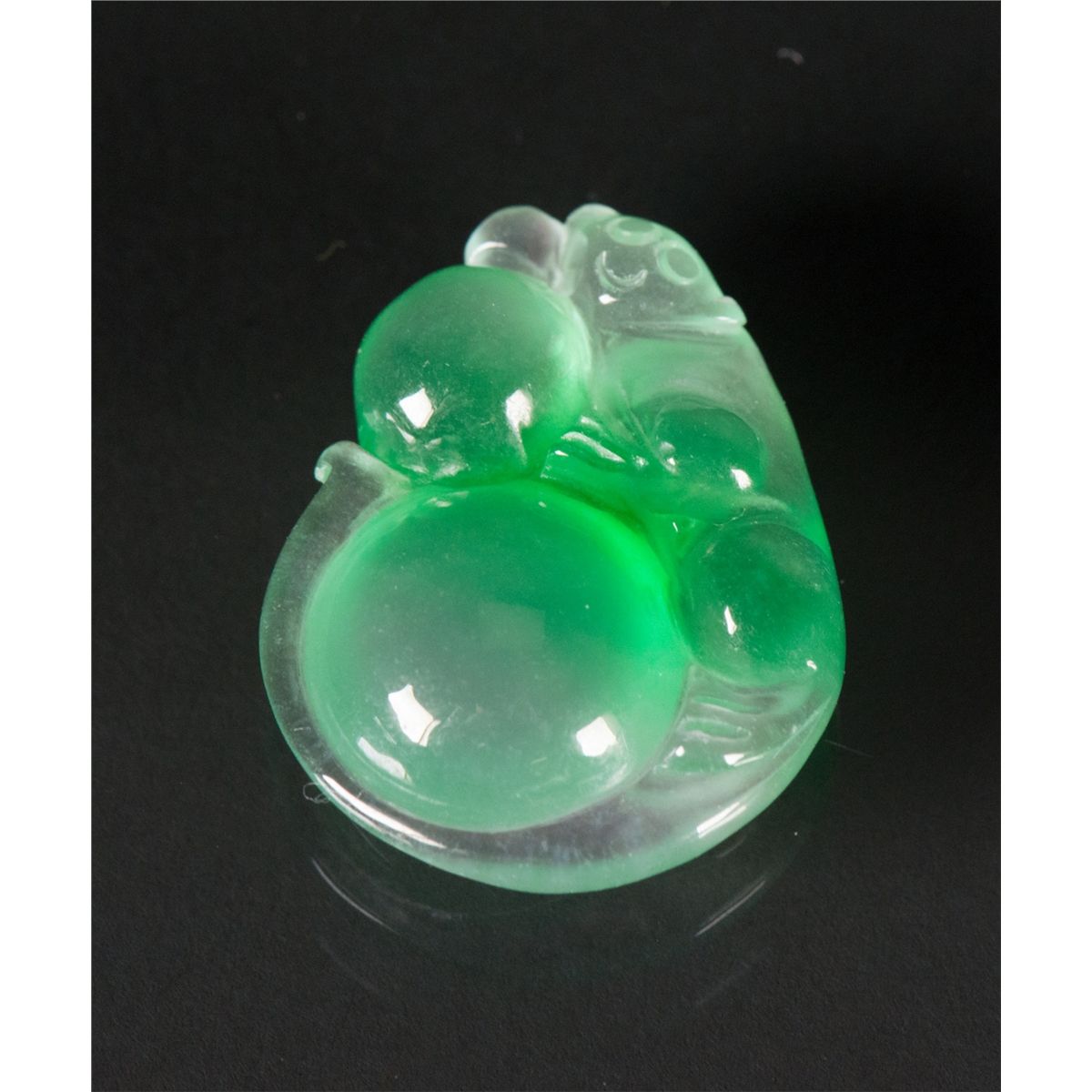 Chinese green jadeite pendant; featuring double-gourd with a bat; of translucent white tone with emerald green suffusions; pierced for suspension; H: 3 cm, W: 2.5 cm, 9 grams, density 3.28