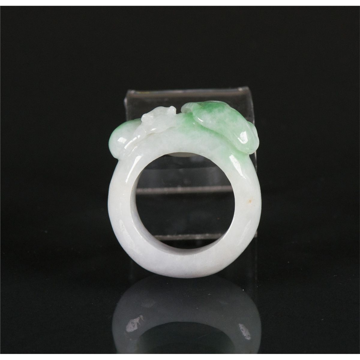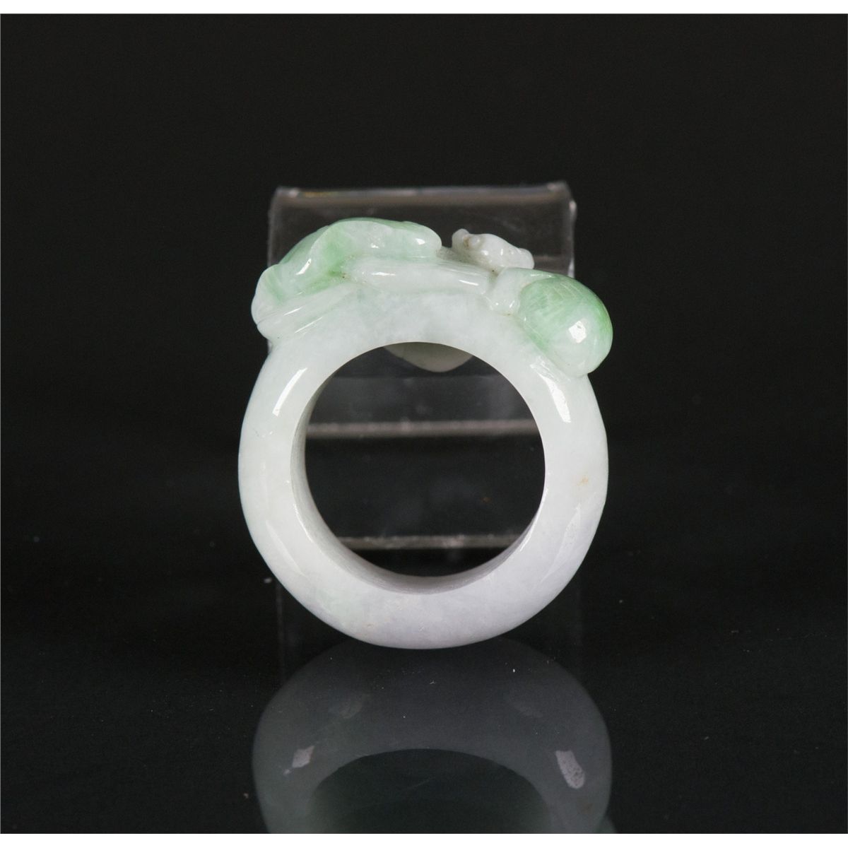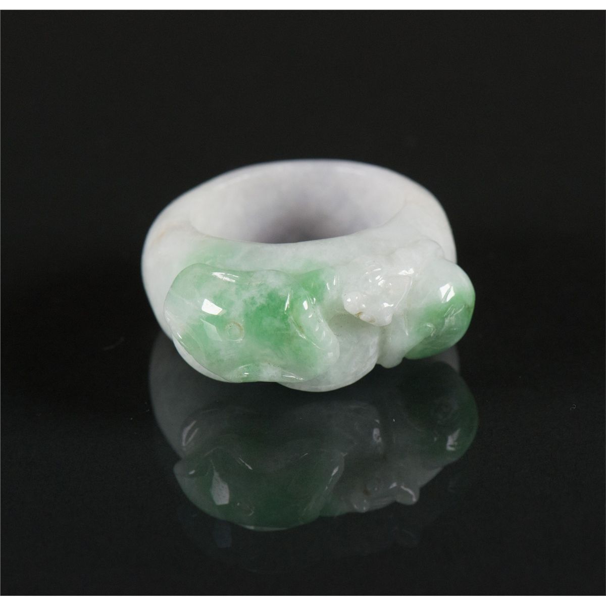 Chinese green jadeite carved archer's ring; featuring Lingzhi, peach and bat; of white tone with emerald green suffusions; D: 3.5 cm, Inner D: 2 cm, 17 grams; Density: 3.28
