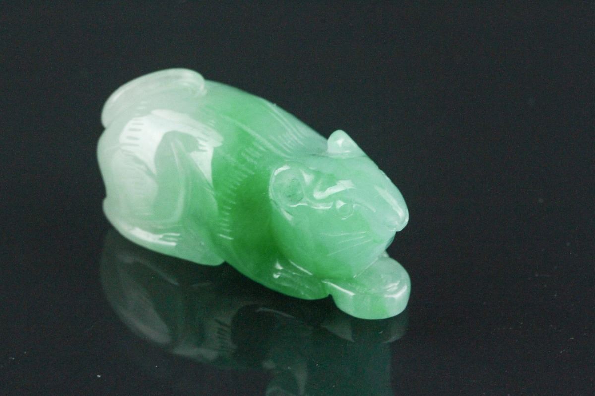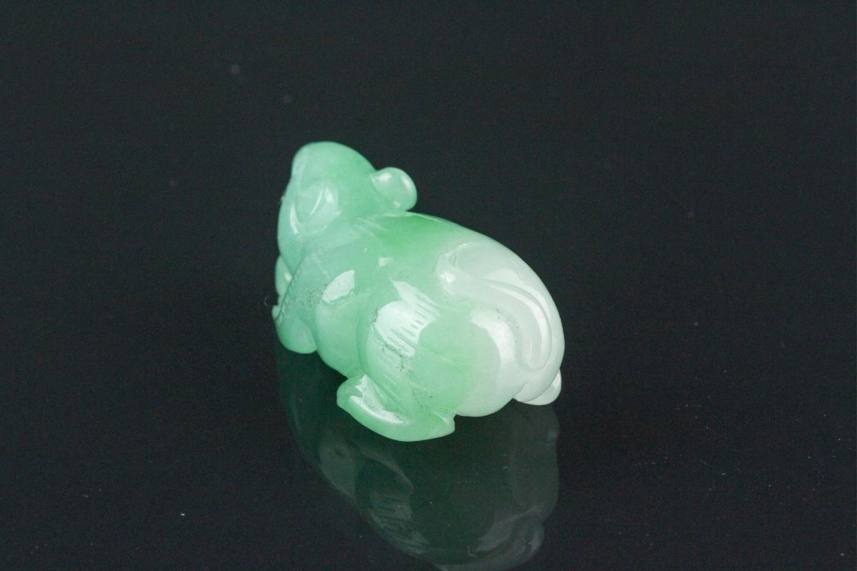 Chinese jadeite toggle; featuring mouse with a coin; of mixed white and apple green tone; H: 2 cm, W: 4 cm, 33 grams; Density: 3.30