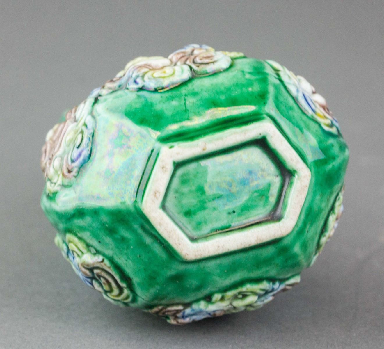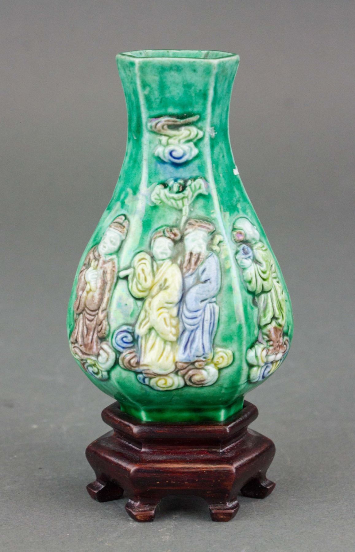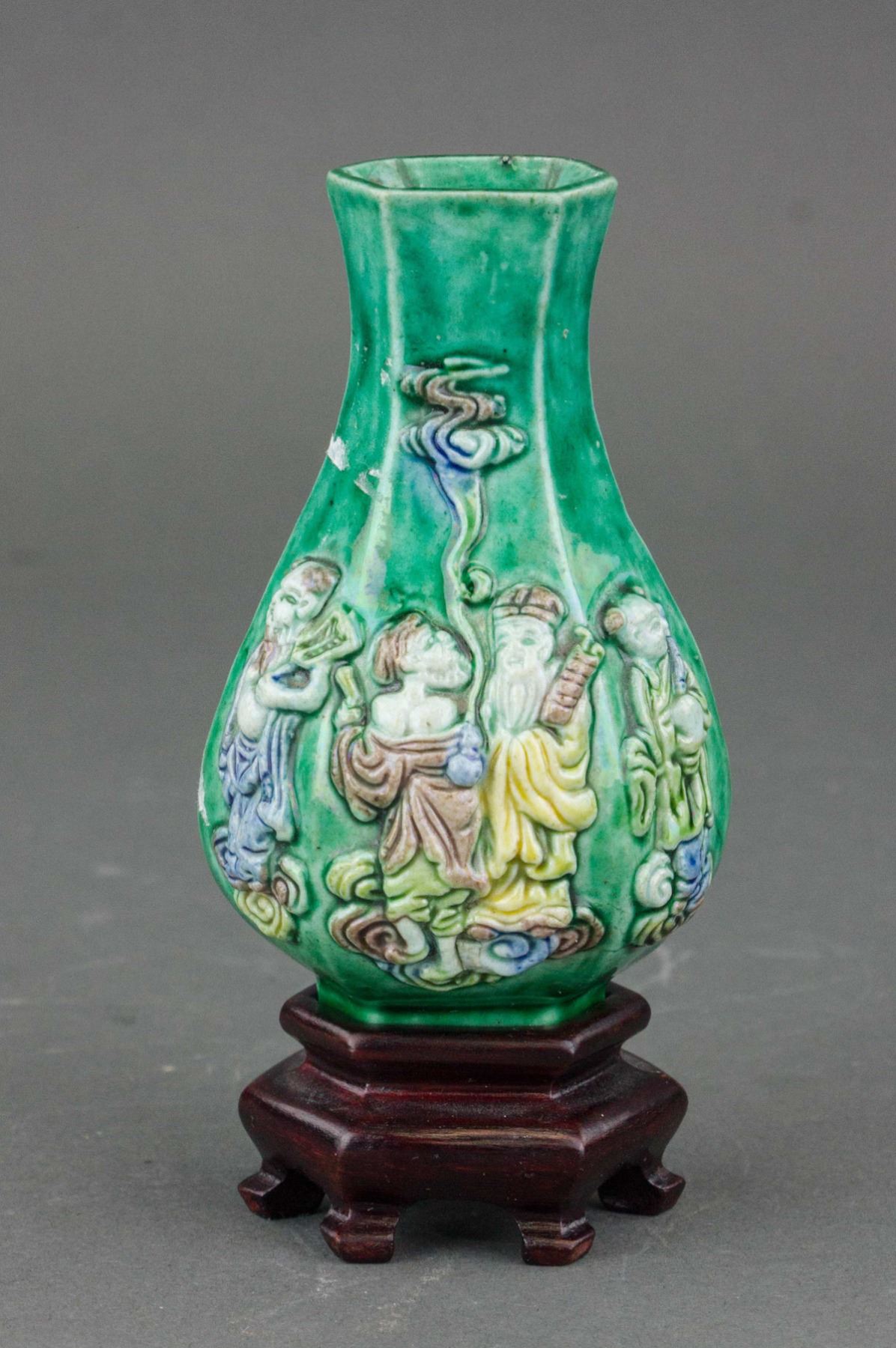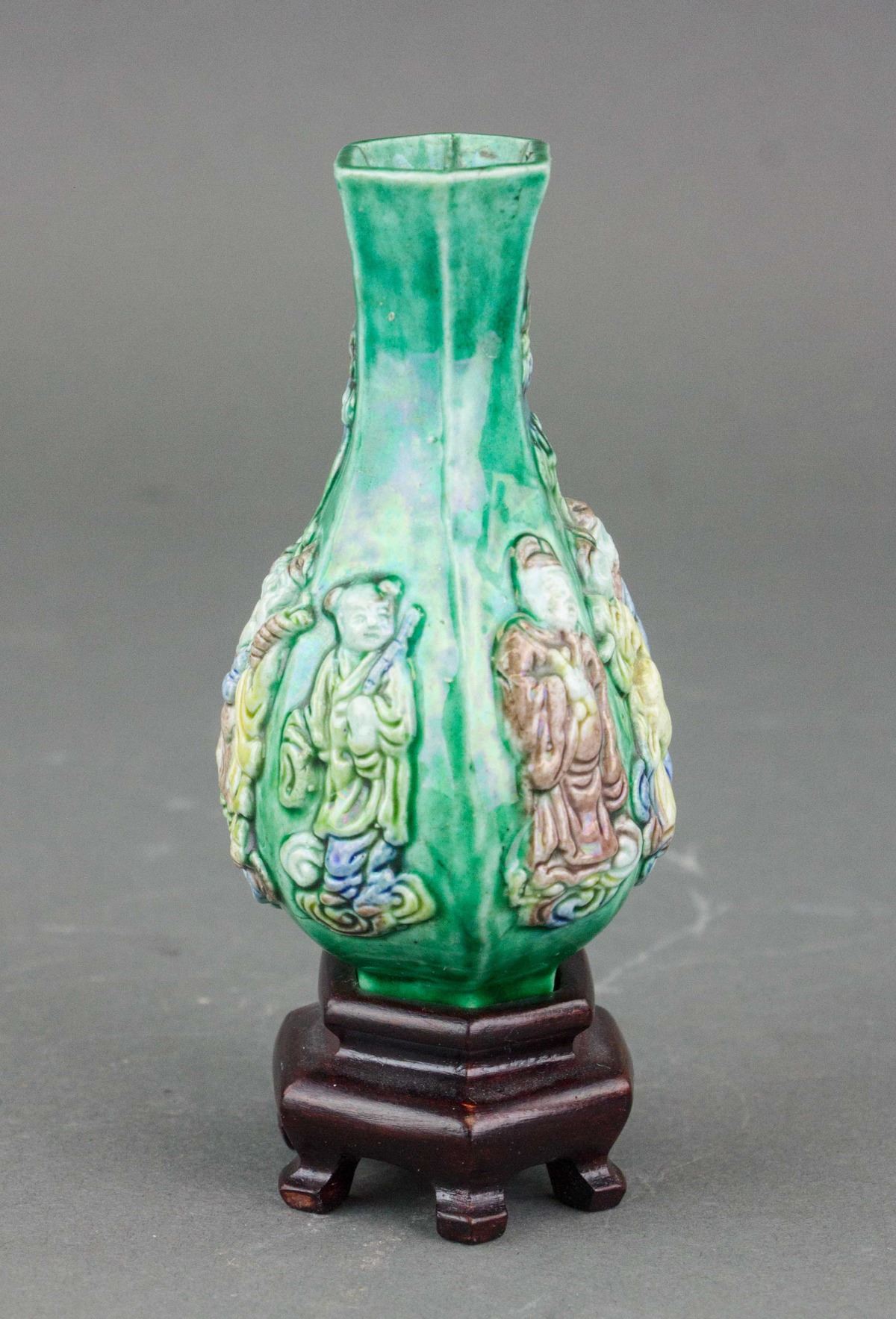 Chinese porcelain vase; of lobed globular body with narrowed neck; featuring eight immortals on the green ground; accompanied with customized wood base; 17th century or later. 11.5 cm x 5.5 cm, 100 grams