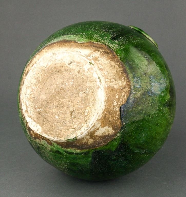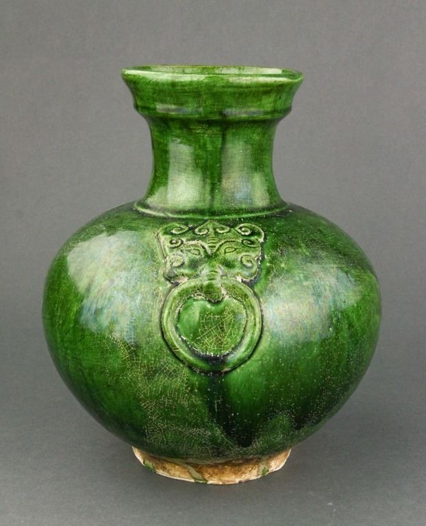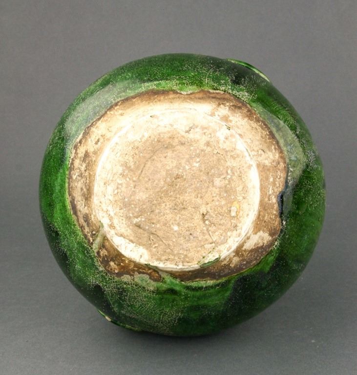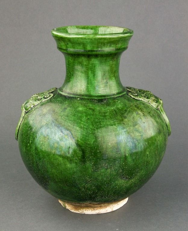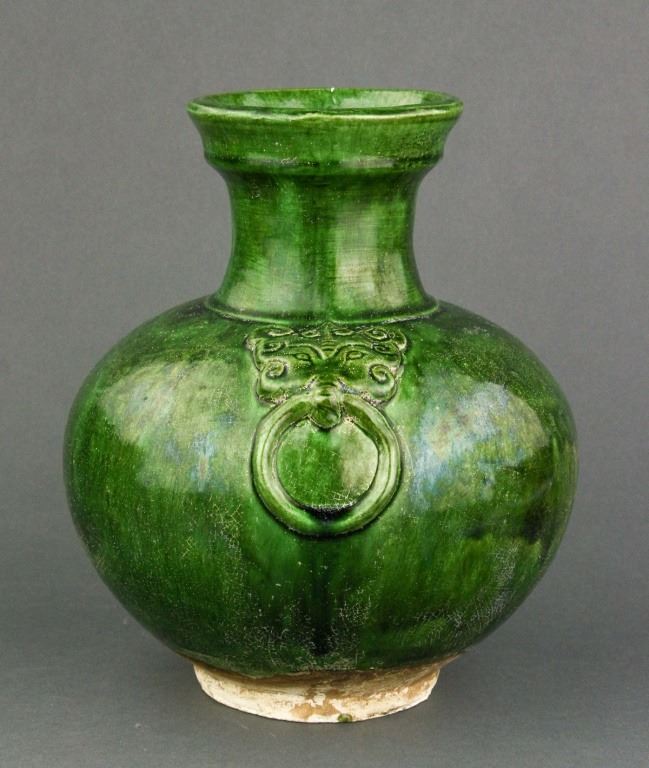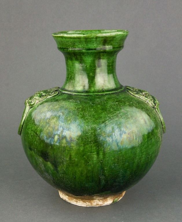 Chinese green-glazed porcelain vase. Tang style and of globular body flanked by double faux-ringed handles; unglazed base. H: 24 cm, D: 10.5 cm, 1660 grams