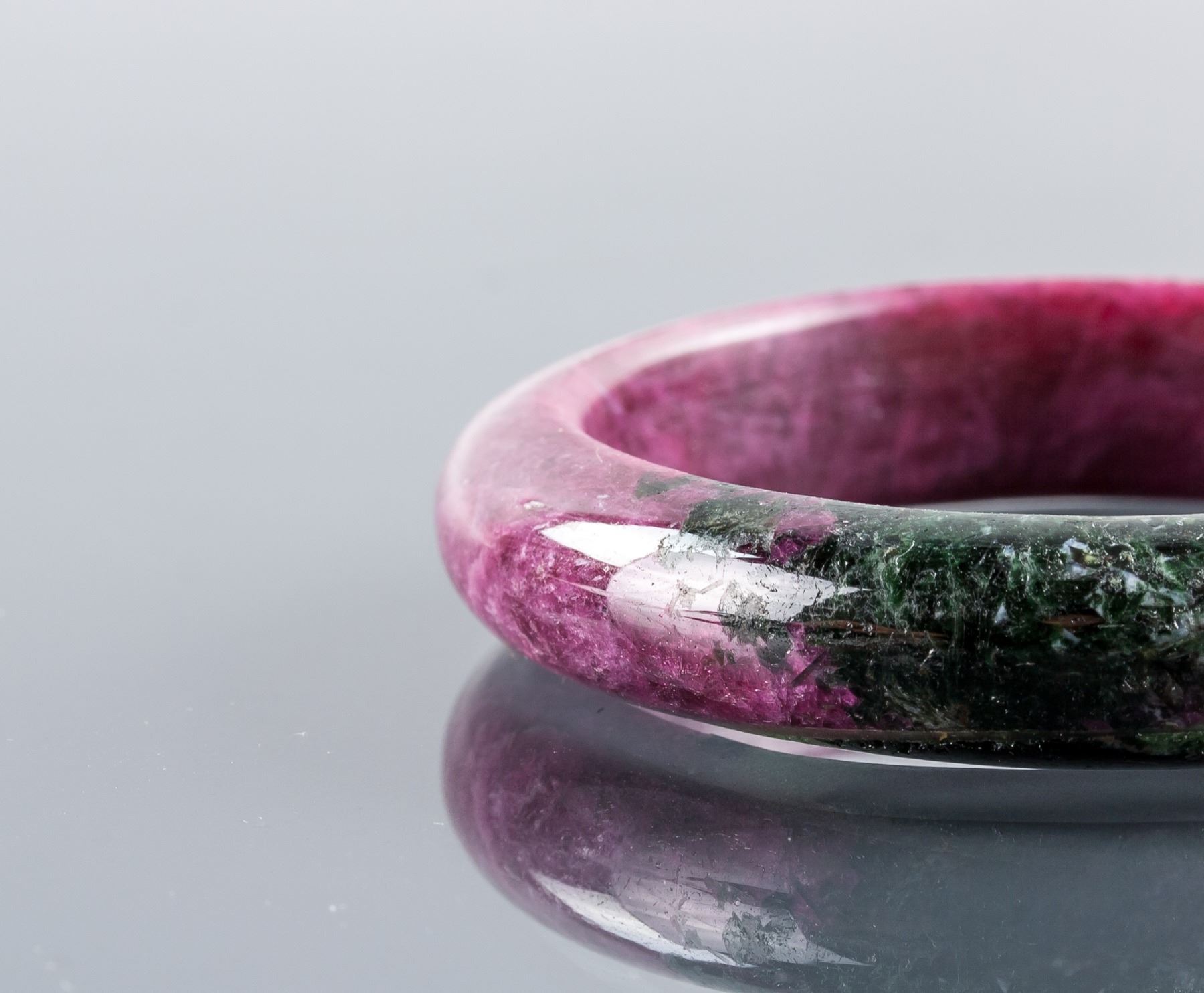 Chinese green and red ruby carved bangle, of round outside and flatten inside, with certification, Inner Diameter: 5.5 cm, Outer Diameter: 7 cm, 55 grams