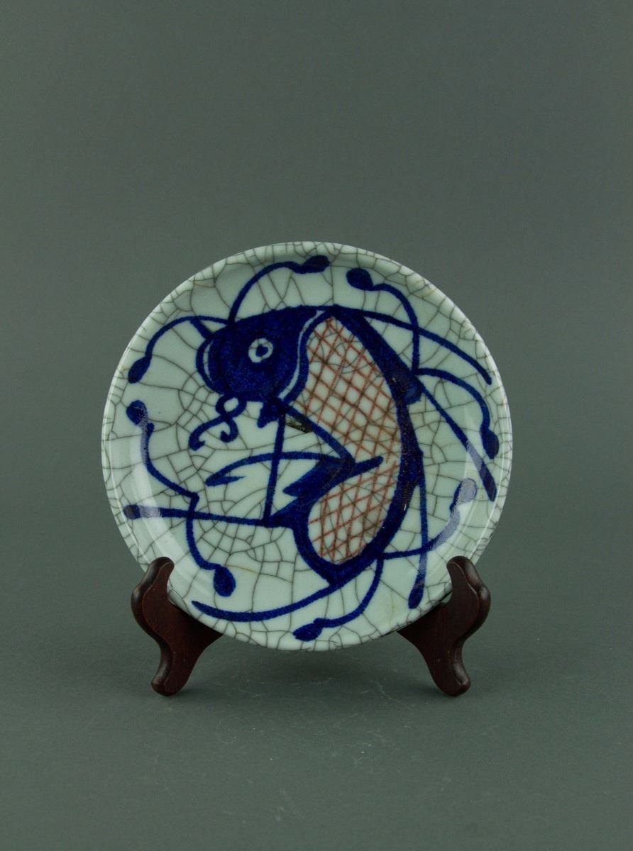 Chinese Guan type porcelain saucer; painted in cobalt blue and copper red with a carp on crackle glazed ground; H: 3 cm, D: 18 cm, 439 grams