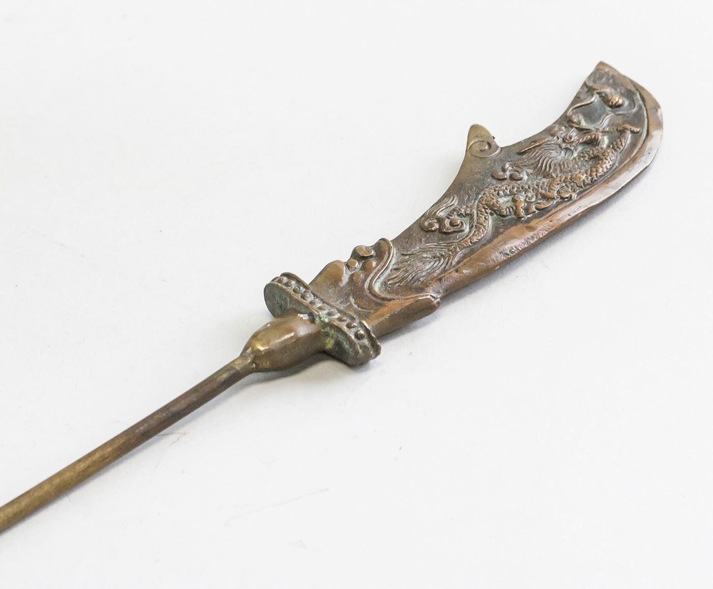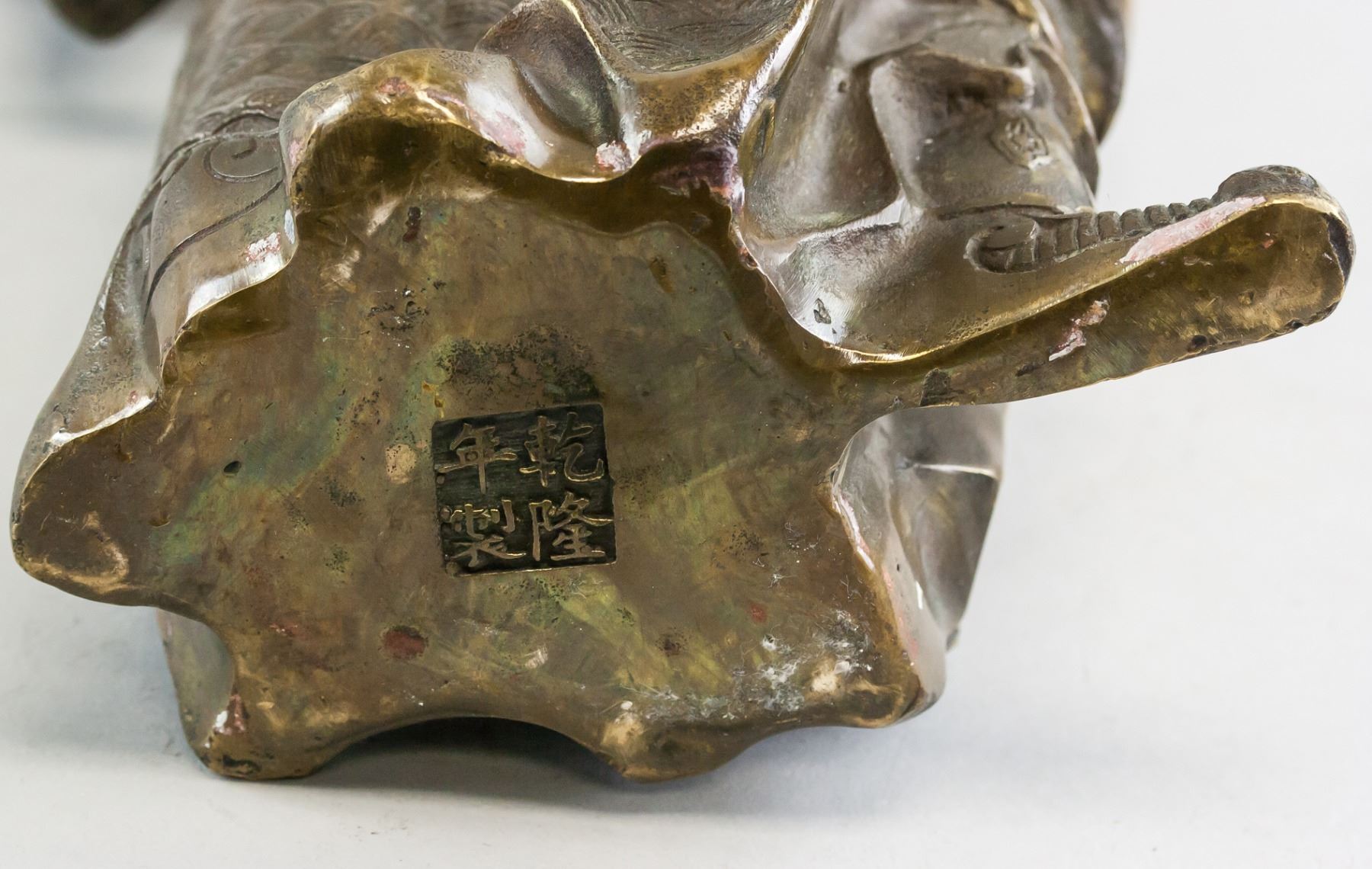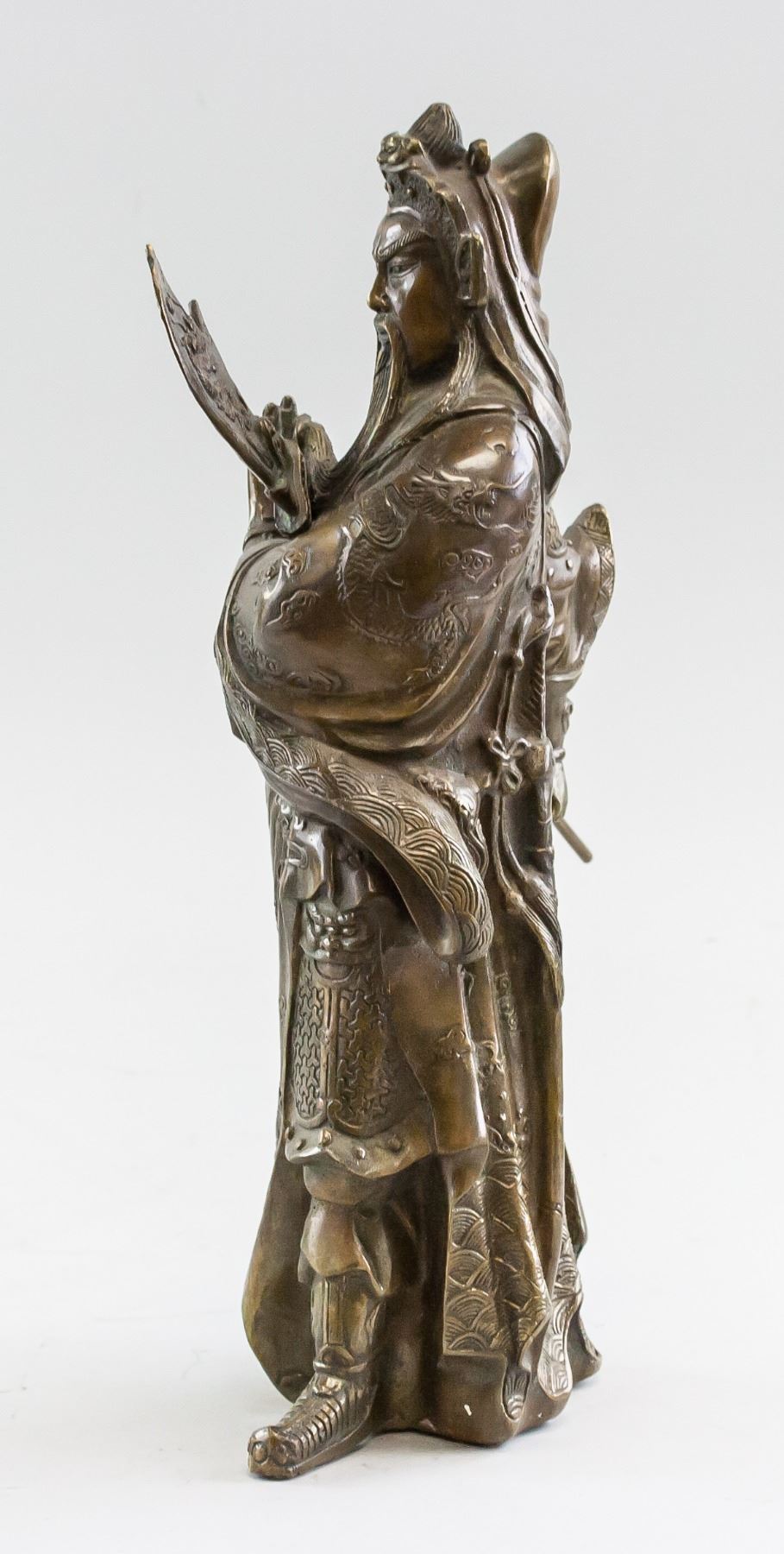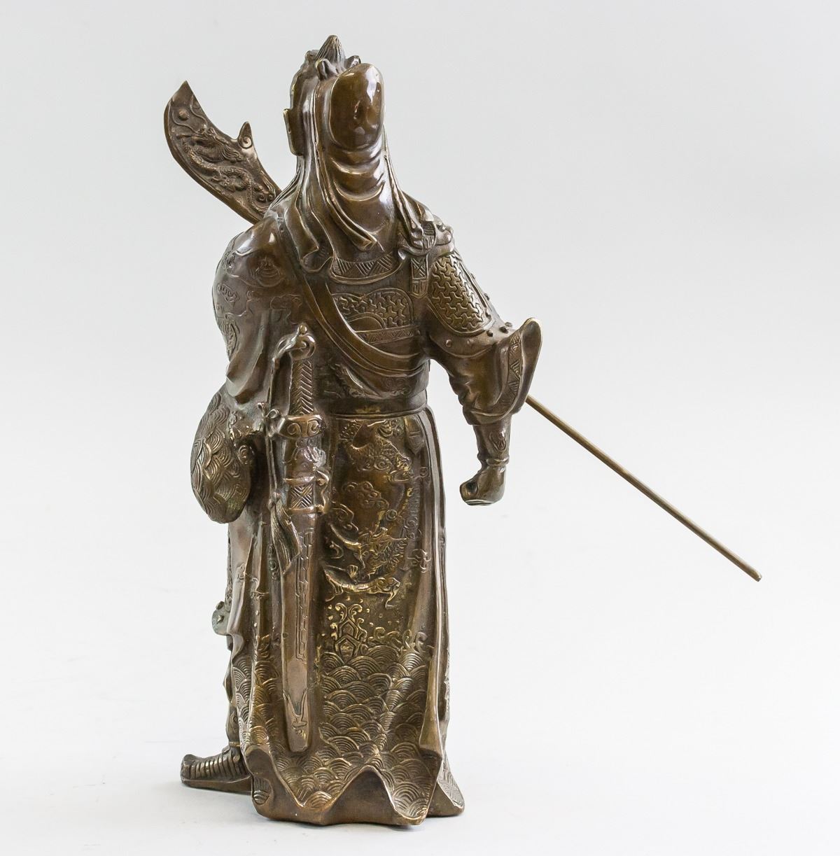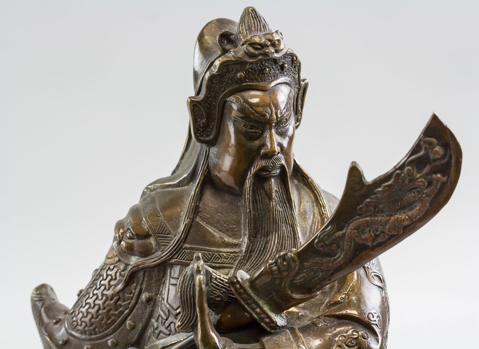 Chinese bronze statue. Depicting Guan Yu. Four character Qianlong mark on base. 35 x 13 cm, 3,881 grams.