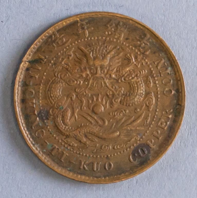 Chinese coin. Both sides reads "GUANG XU NIAN ZAO / TAI-CHING-TI-KUO COPPER COIN. Dragon with pearl at centre. 3 cm. 7 grams.