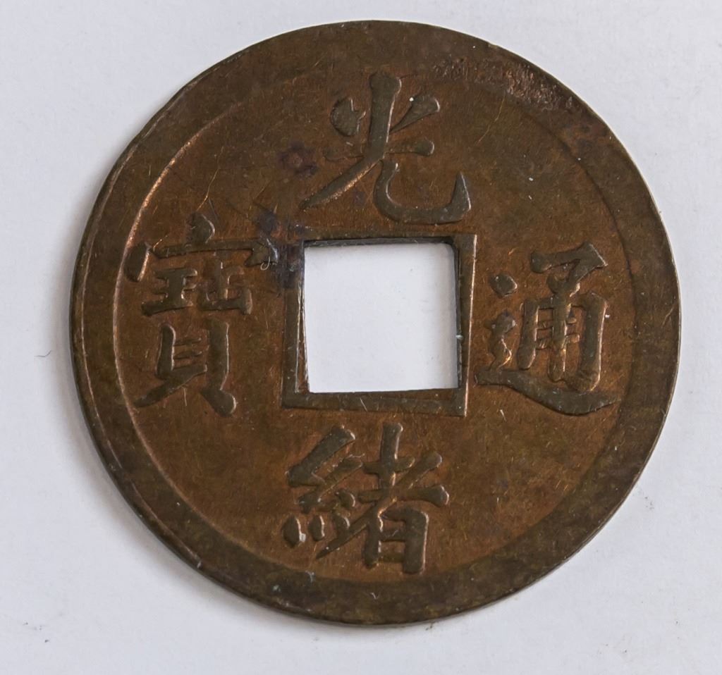 Chinese coin. Obverse: Four Chinese ideograms read top to bottom, right to left. Lettering (romanized): GUANG XU TONG BAO. Reverse: Two Manchu words (read vertically) separated by the hole. Diameter: 2.5 cm. 2 grams.