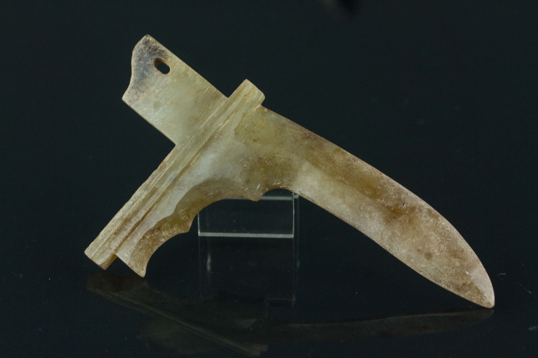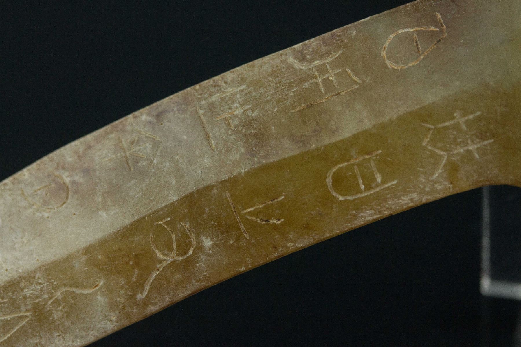 Chinese Hetian jade carved Ge; of Chinese weapon ge shape; with carved letters on body; of white and yellow tone; Han period; H: 0.4 cm, W: 6.5 cm, L: 12 cm, 31 grams, Density: 2.95