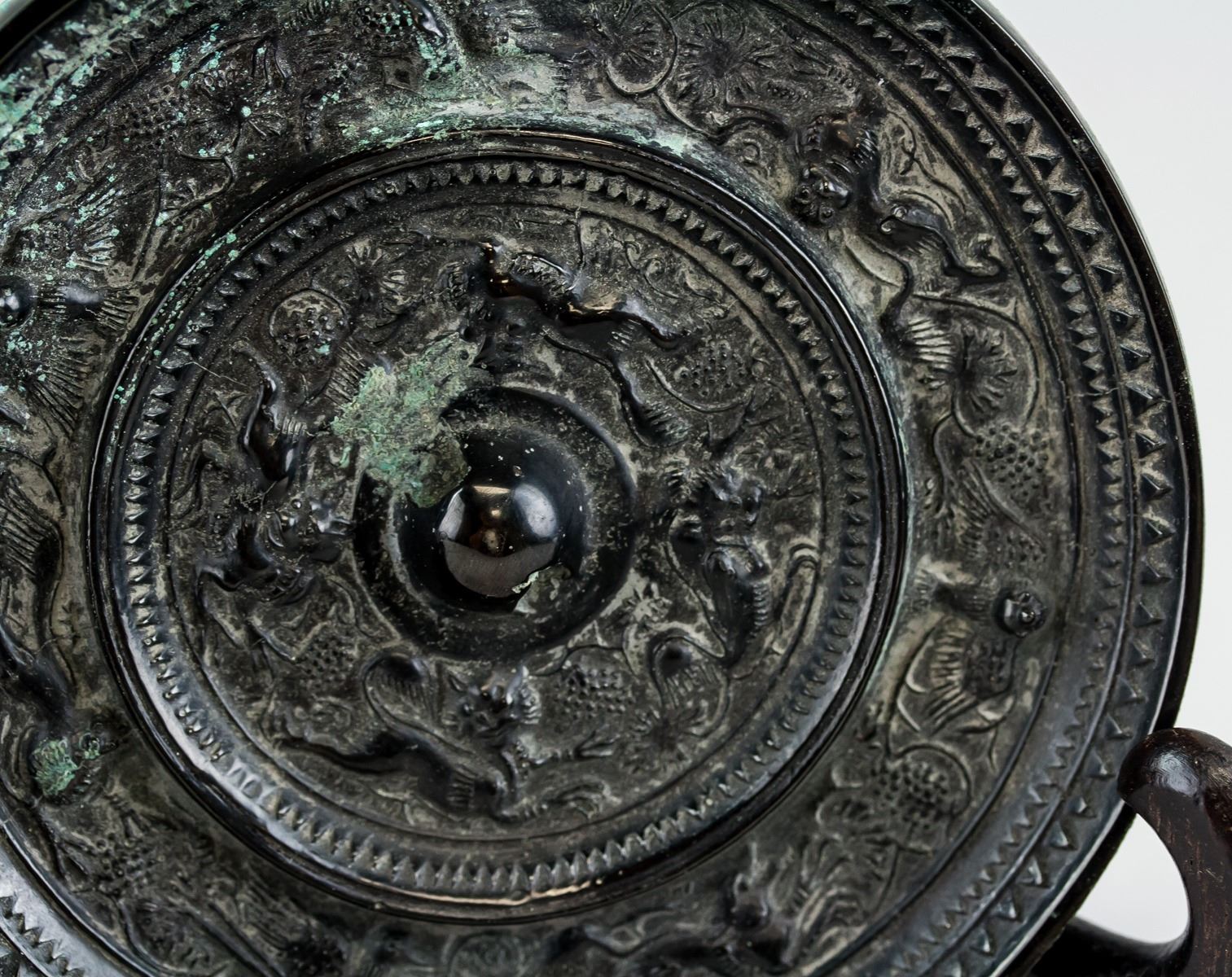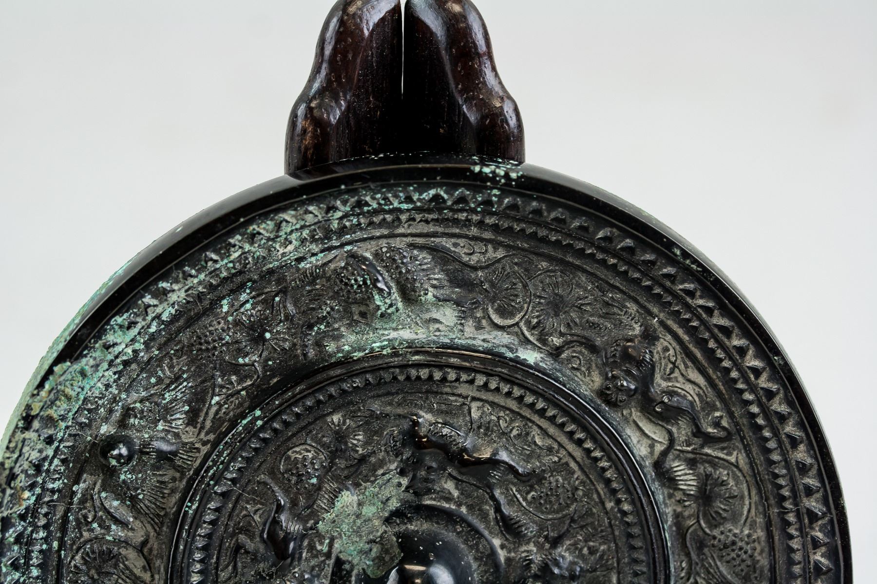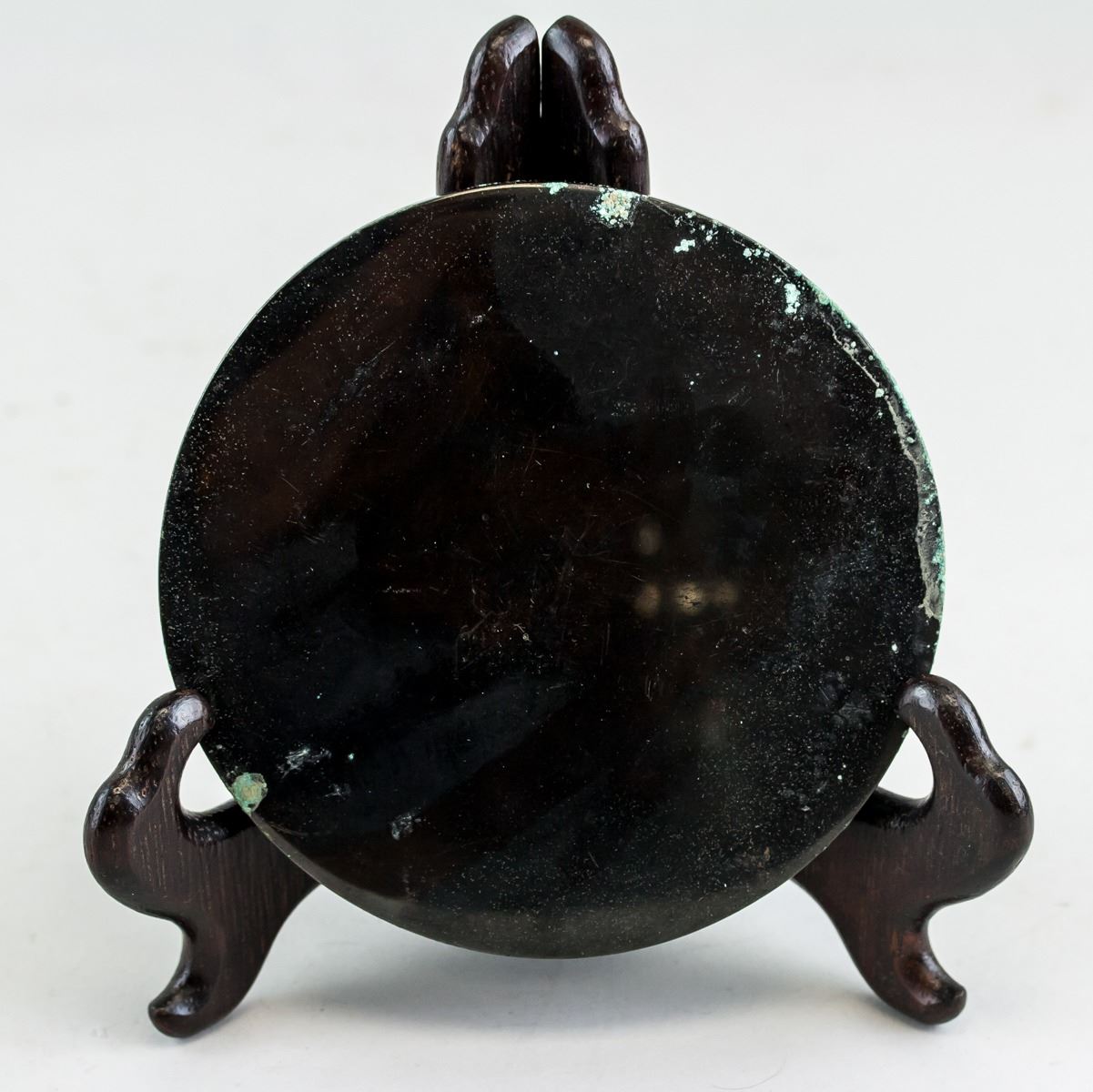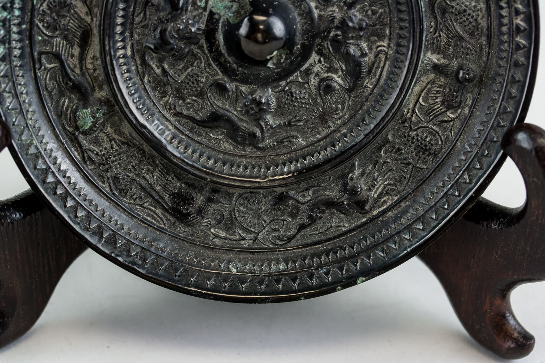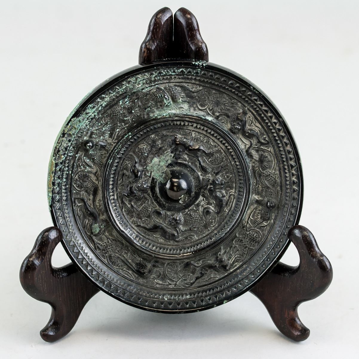 Chinese Han style bronze mirror. Of round shape. Carved with beasts on surface. 1.5 x 12 cm, 457 grams