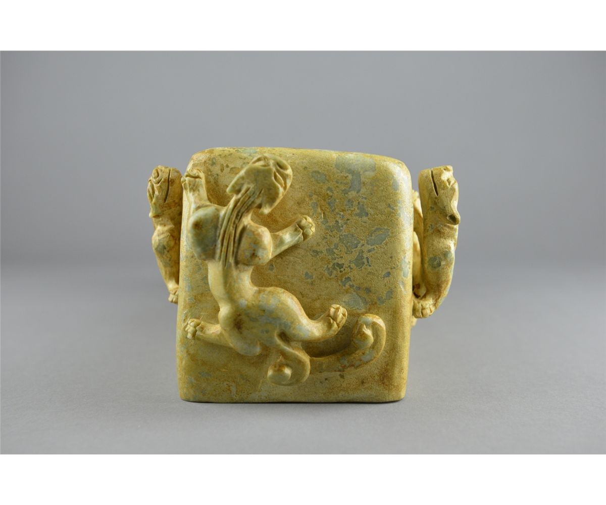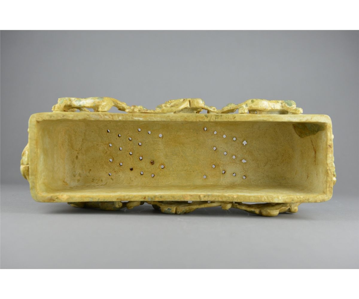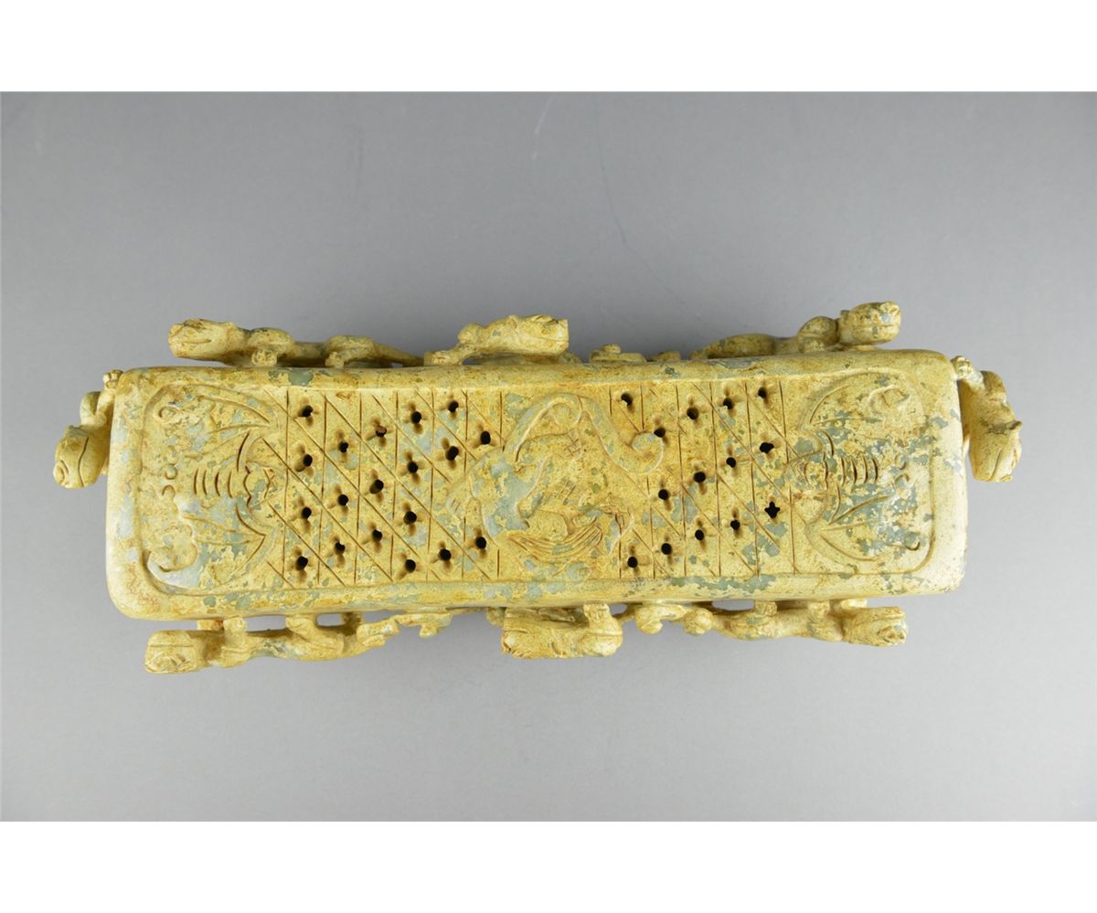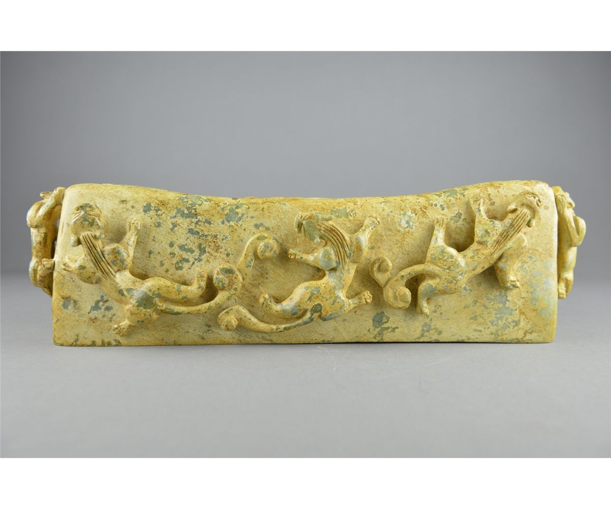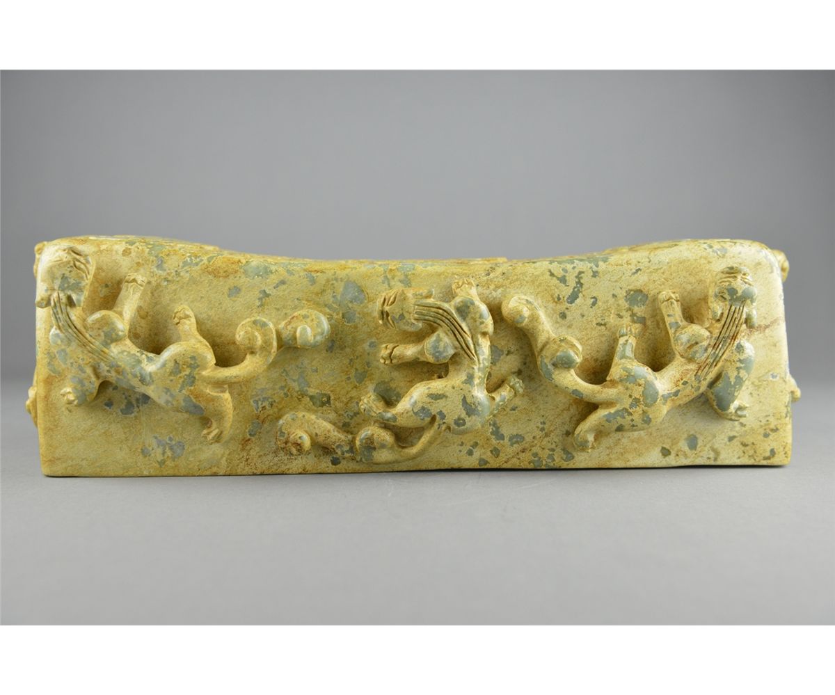 Chinese Han-style carved jade pillow; featuring mythical beasts in relief and openwork relief carvings on top of pillow; the stone of translucent celadon tone with calcification; L: 39 cm, W: 15 cm, H: 11 cm, 3629 grams; Provenance: Private Richmond Hill collector