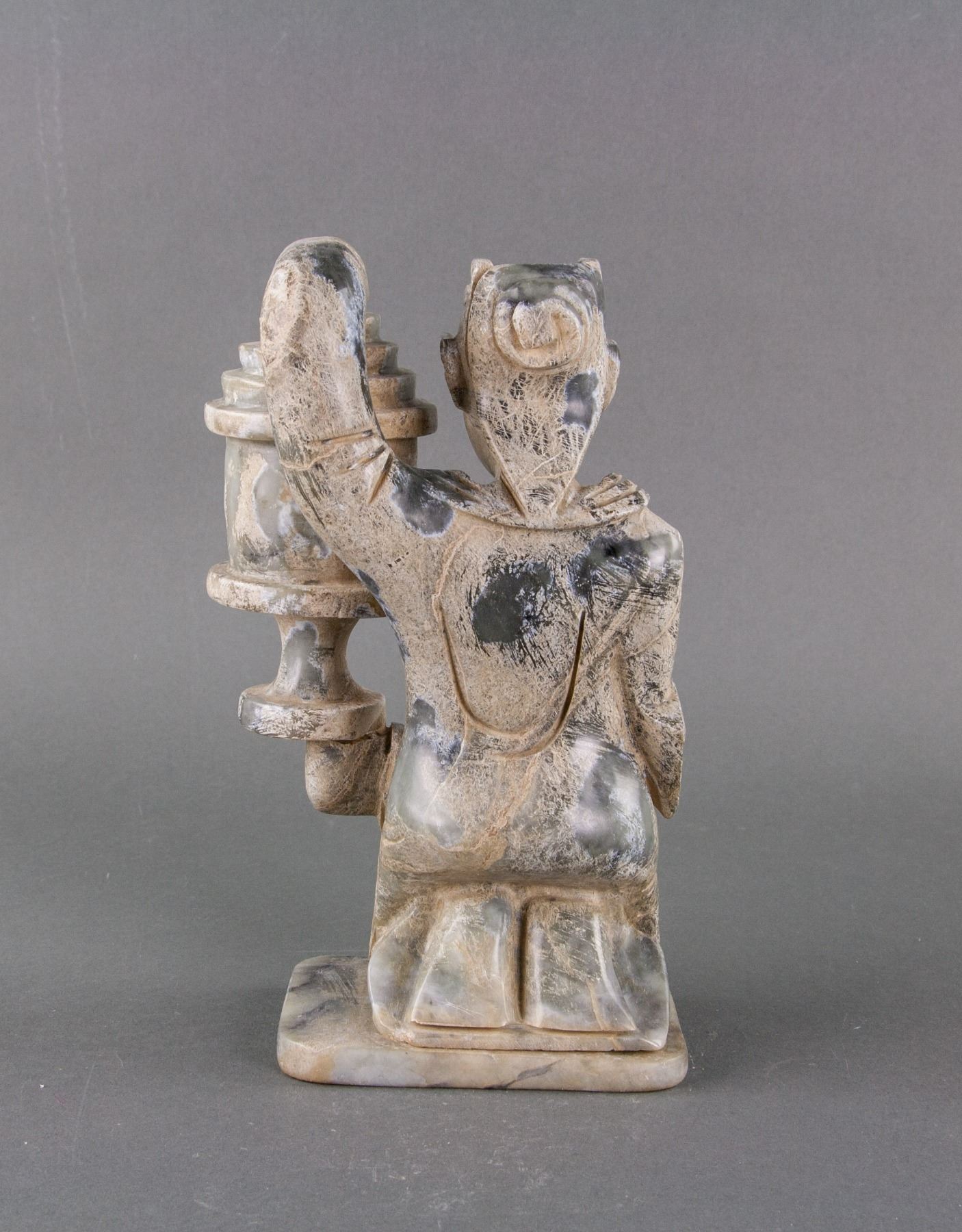 Chinese Han/Tang style green jade carved statue; carved in a half kneeled man holding a lamp; of pale green tone with dark green tinge; 22 cm x 15 cm, 2955 grams