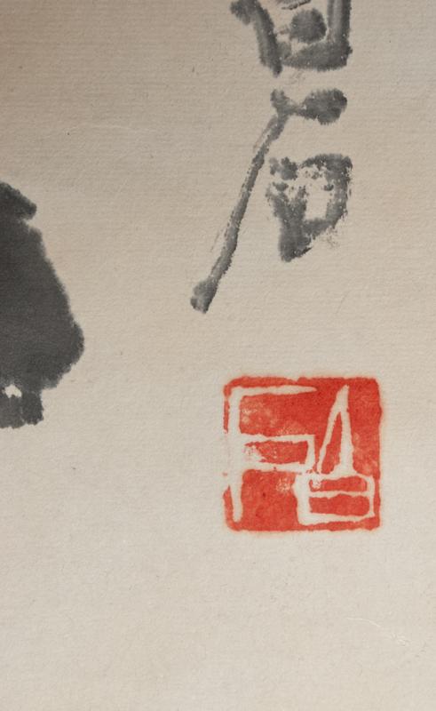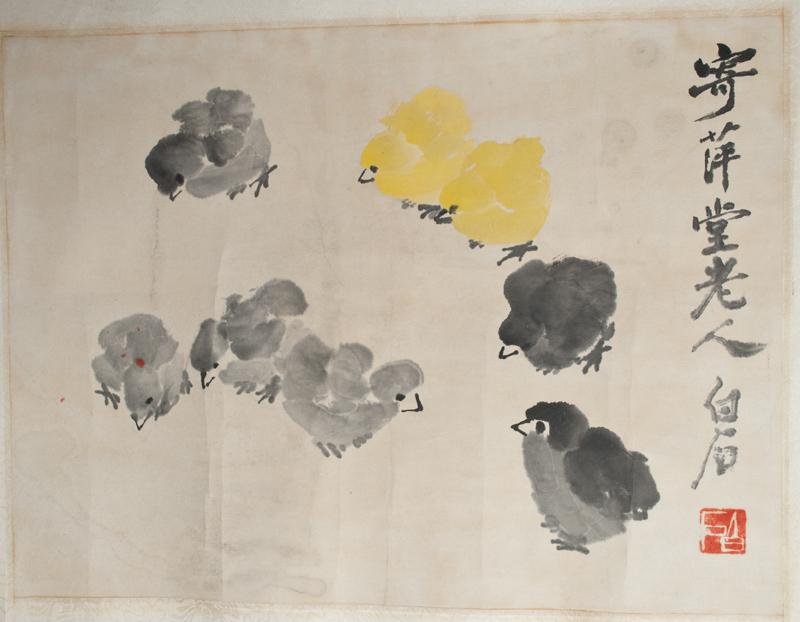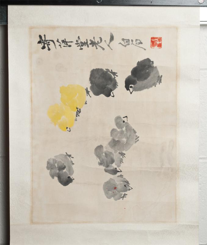 Painted to depict chicks in yellow and black.13" H x 17" W (sight), red seal mark and calligraphy along right side.