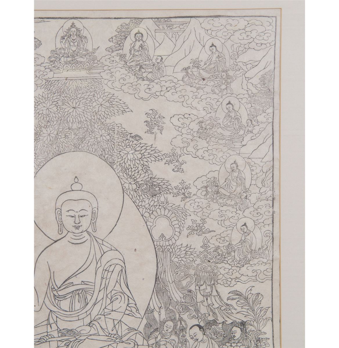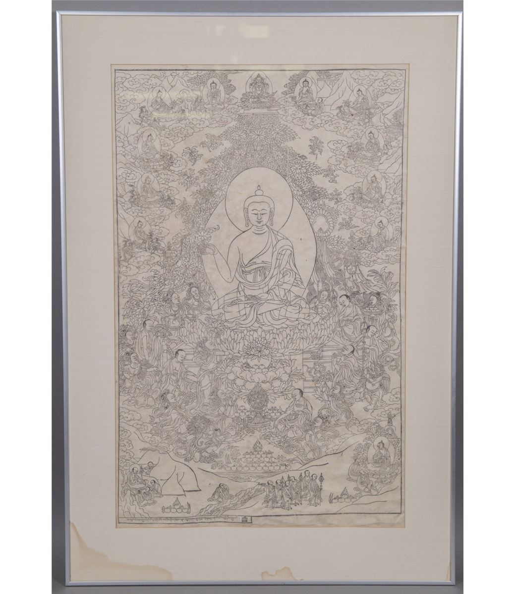 Chinese hand rice paper litho thangka (tanka); featuring Buddha surrounded by Lohans; H: 91 cm, W: 62 cm