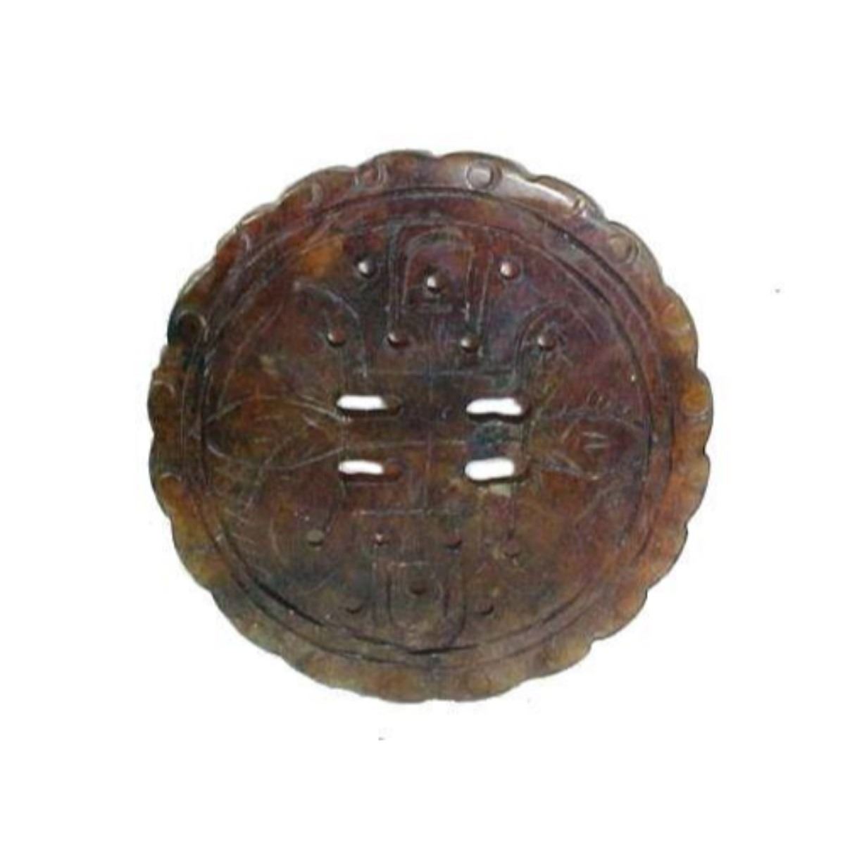 Chinese brown to green serpentine medallion pendant, hand-carved & pierced in the form of a decorative coin. 55mm diameter X 3mm thick. Â