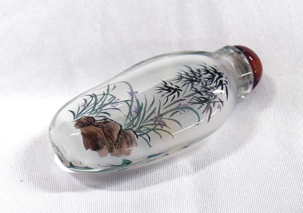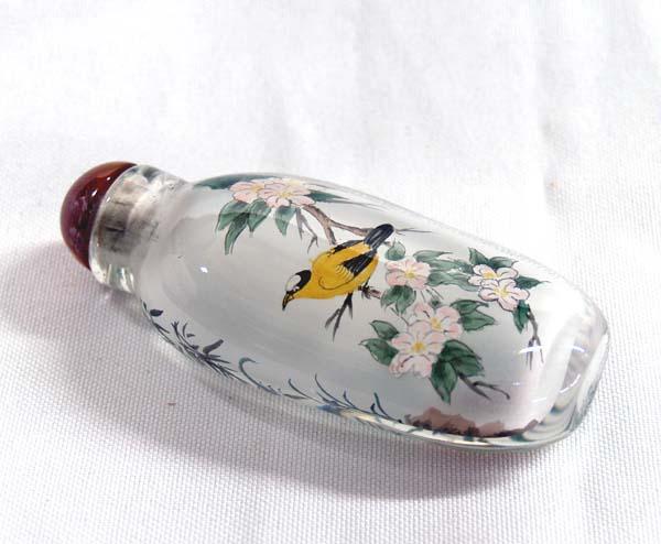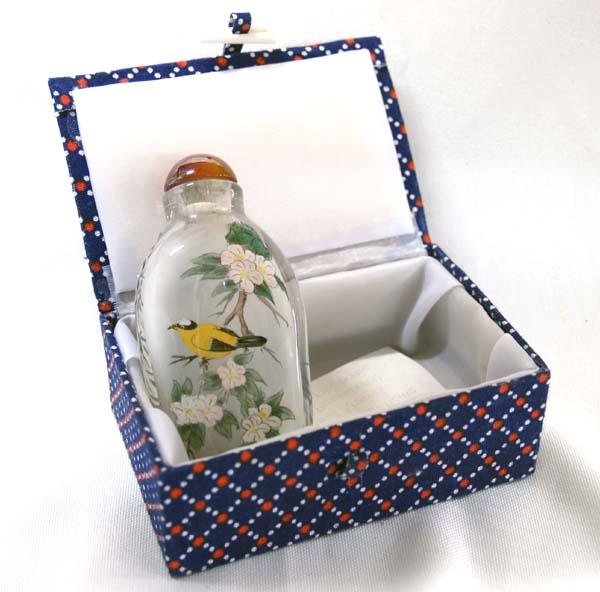 Chinese Hand painted Snuff Bottle, painting on inside of bottle in cloth covered box, glass stopper. Bottle measures approx. 3''H x 1 5/8''W. Buyers Pay Actual Shipping and Handling Charges(see terms and conditions for more information)