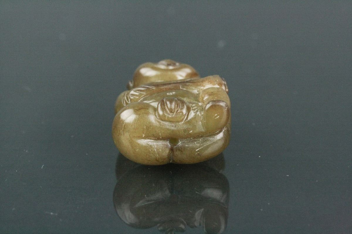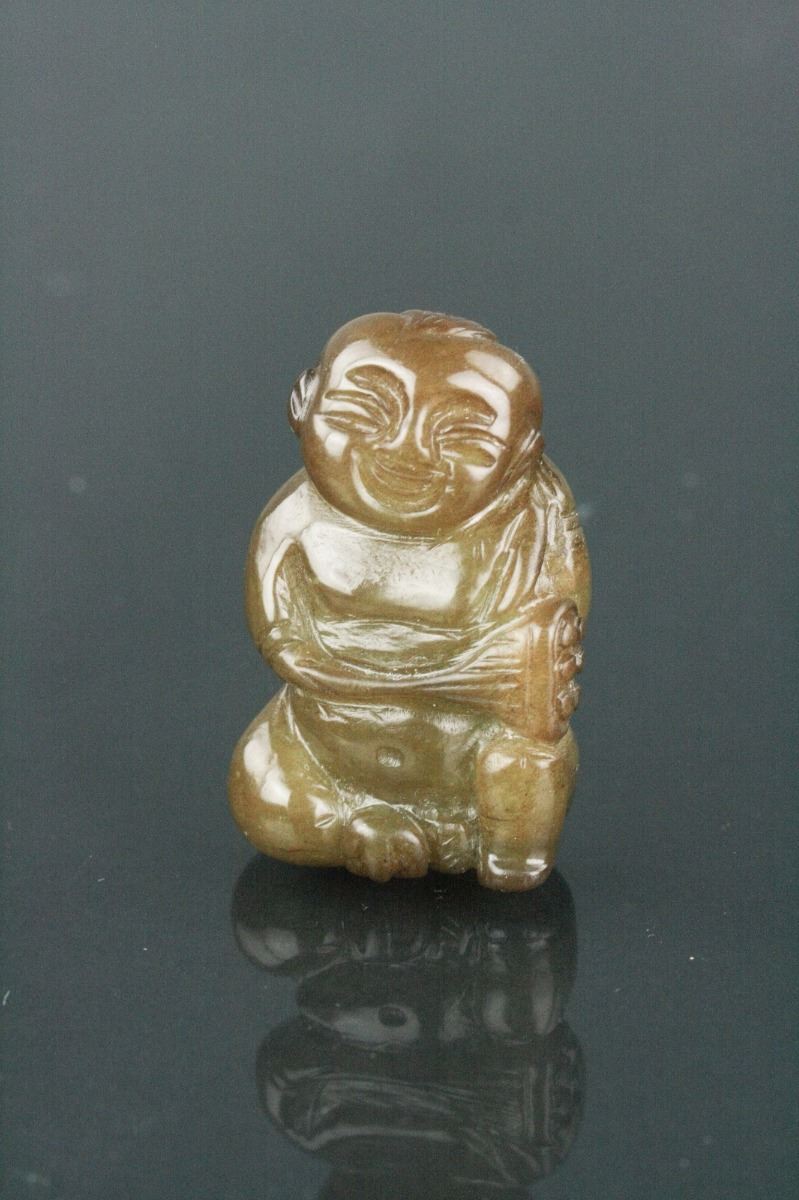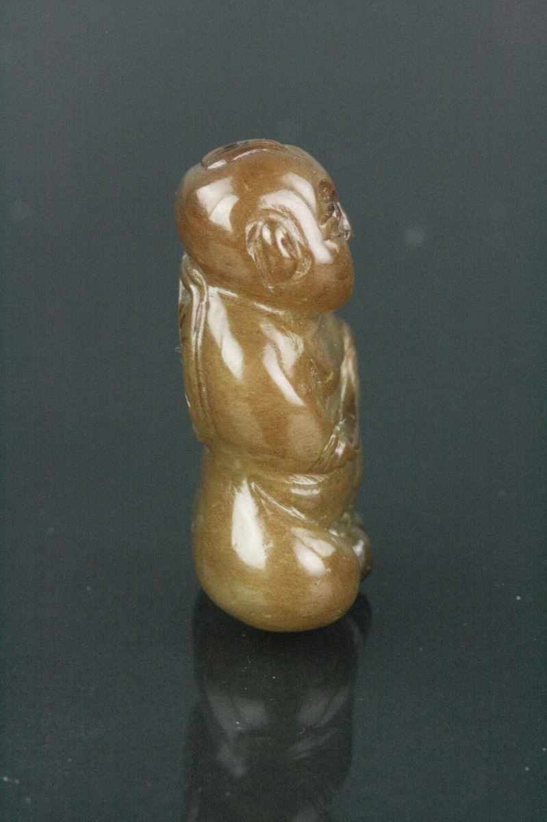 Chinese hardstone carved toggle; featuring boy holding lotus seedpod; of yellowish brown tone; H: 5 cm, W: 3 cm, 47 grams