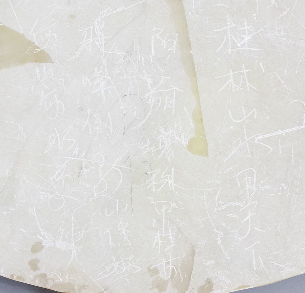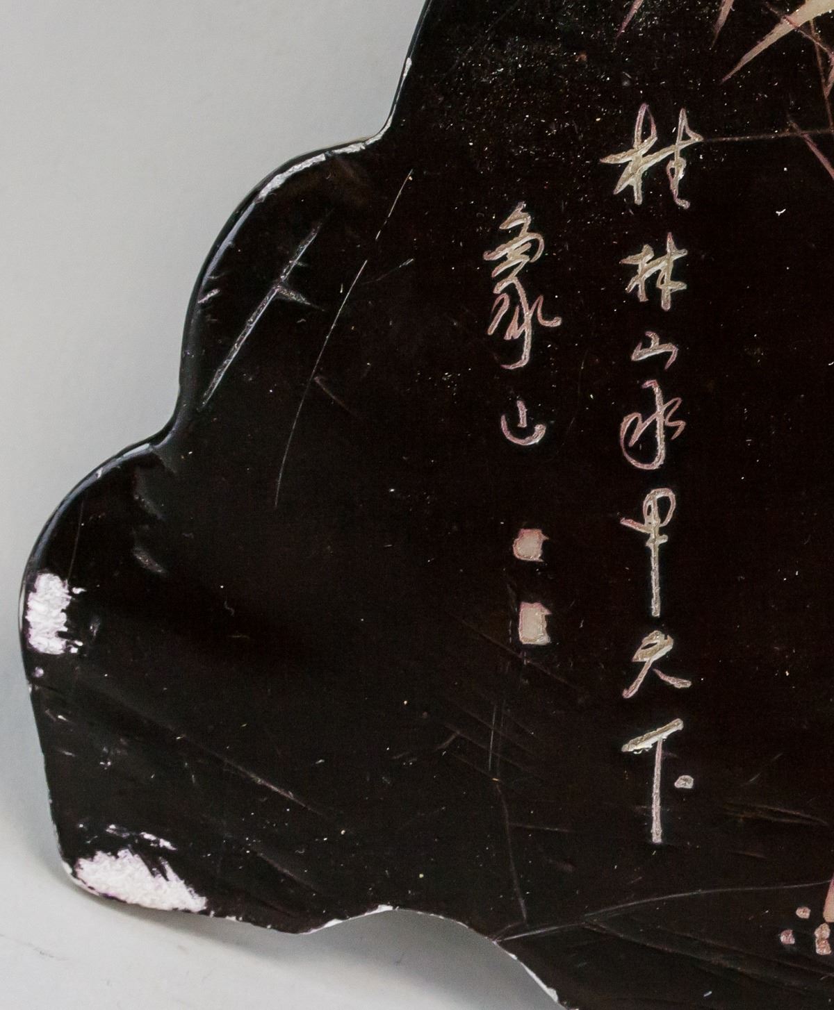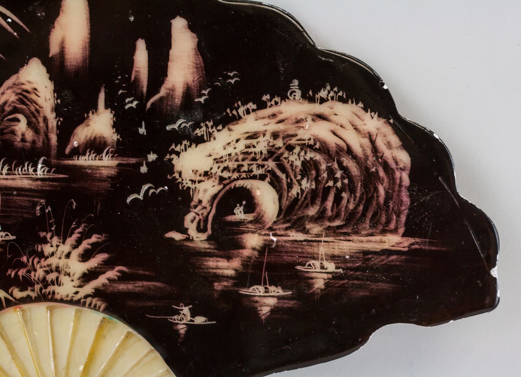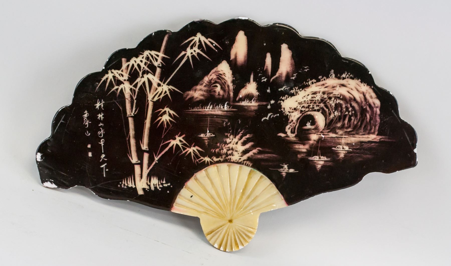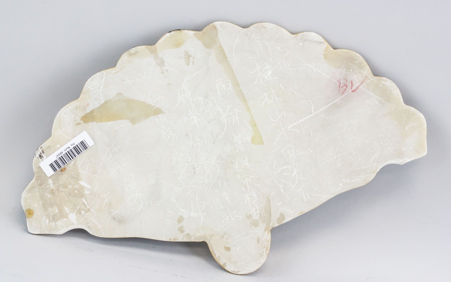 Chinese hardstone carved fan decoration. Featuring mountainous landscape of Guyin. 20 x 32 cm (7.75 x 12.5 in)