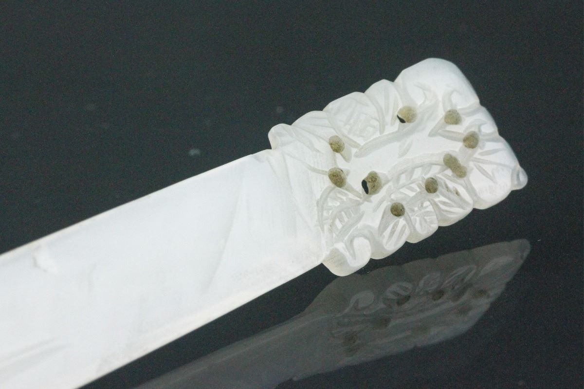 Chinese hardstone carved hair pin; featuring leafy scrollwork at one end; of white tone;L: 13.5 cm, W: 1.5 cm, 14 grams