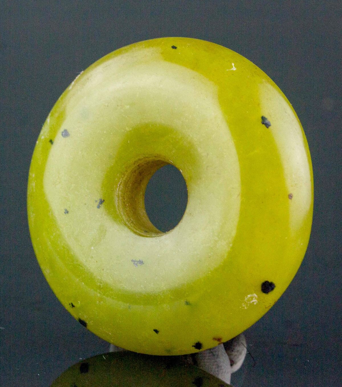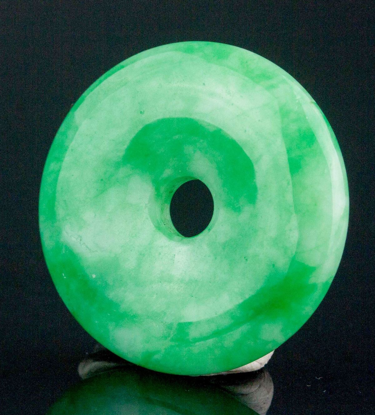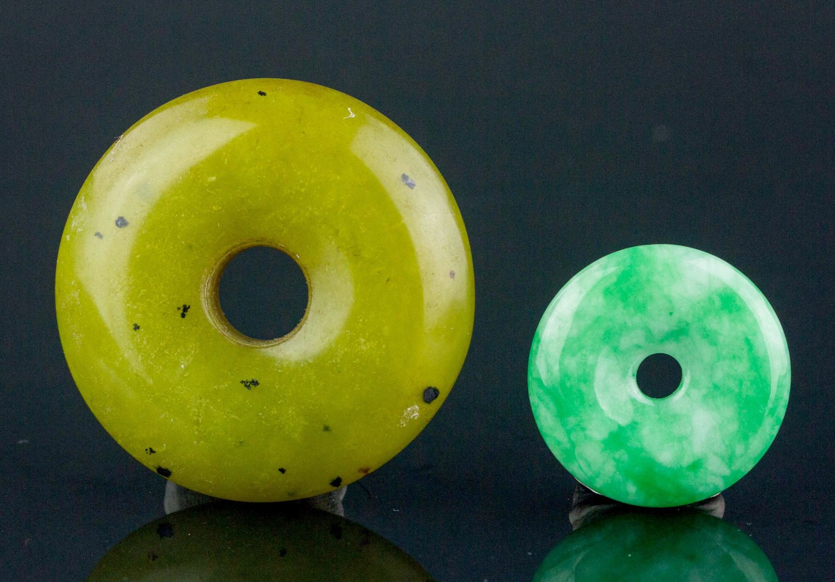 Two assorted Chinese hardstone pendant; carved in a circle form with a hold in the middle; one of yellow tone with black tinge; one of green tone; pierced for suspension; D: 3 cm - 4.9 cm, 51 grams (Both), Density: 2.62, 2.57