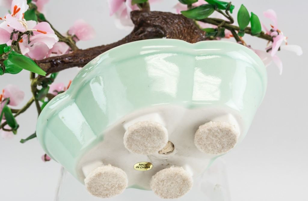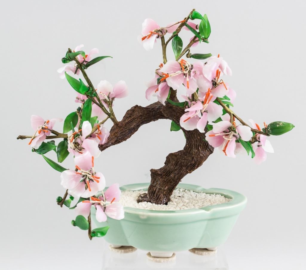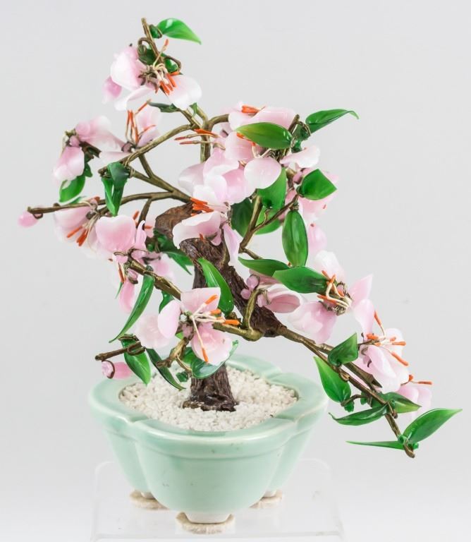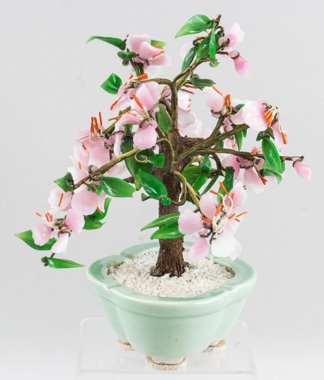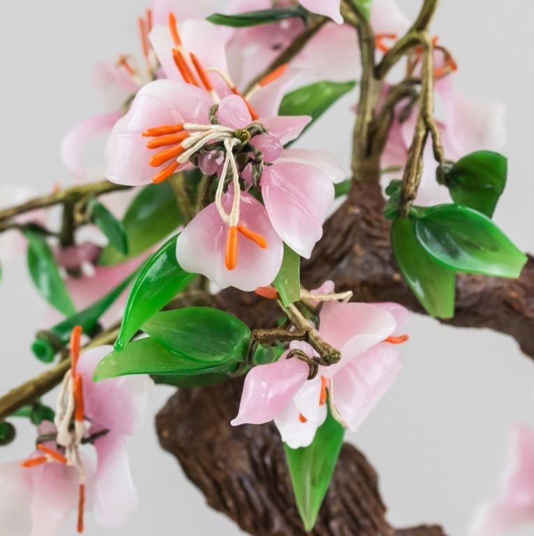 Chinese hardstone tree in pot. With pink petals and green leaves. 25 x 28 cm. 1,167 grams.