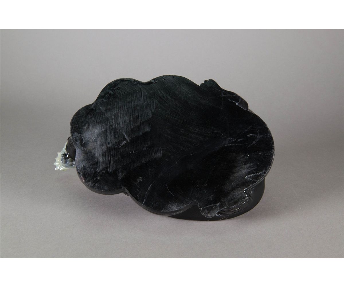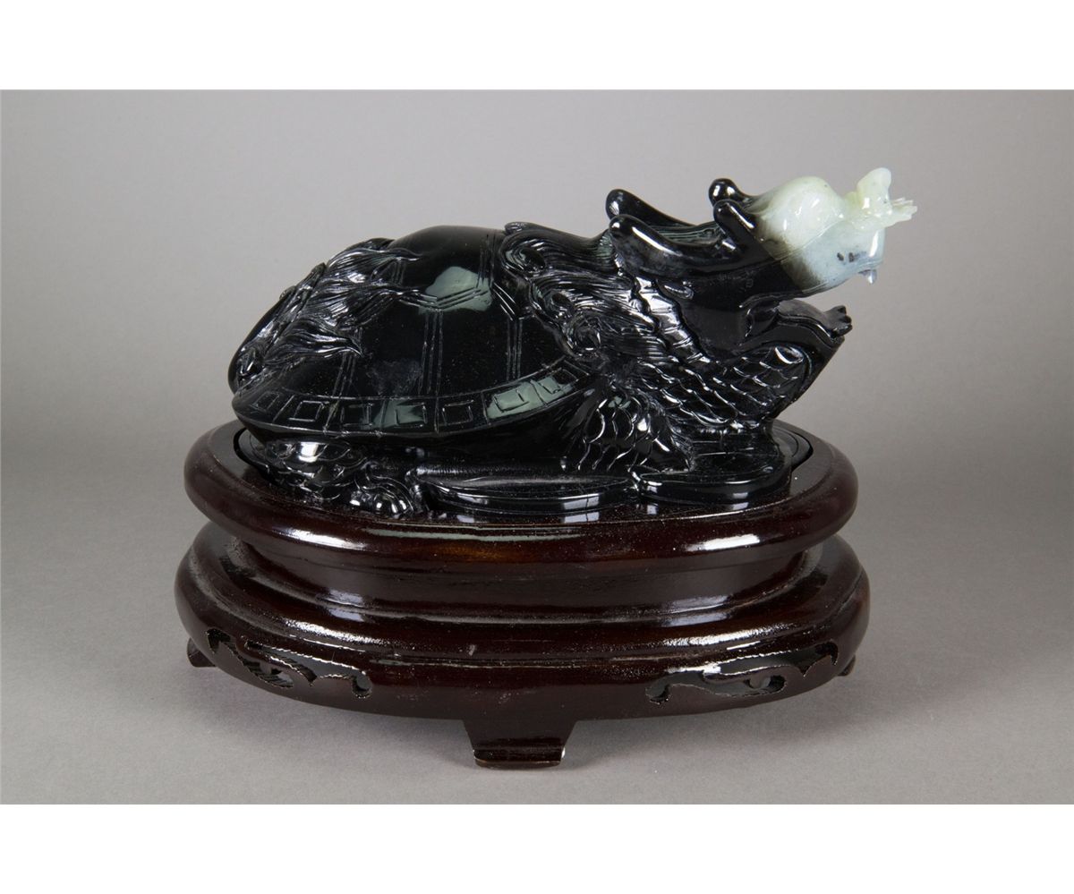Chinese hardstone carved figure; featuring a turtle with dragon head; of mixed green tone; custom wood stand included; H: 15 cm, W: 24 cm, 3921 grams