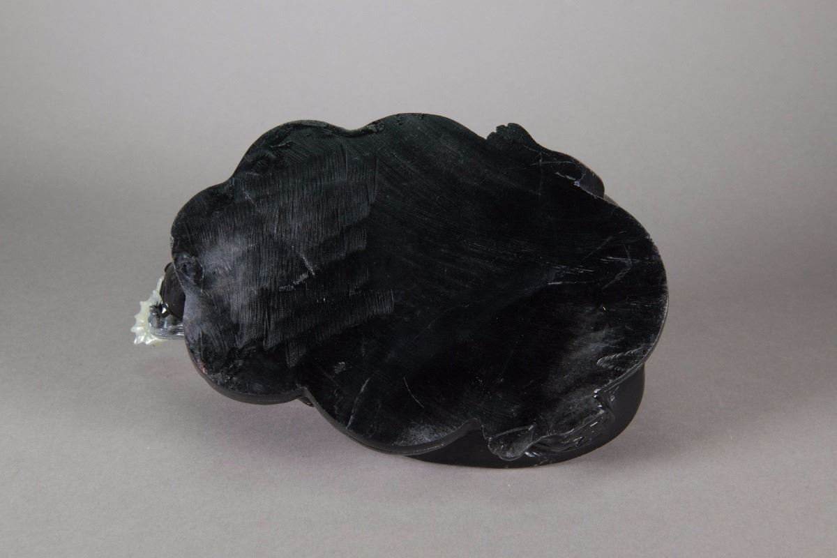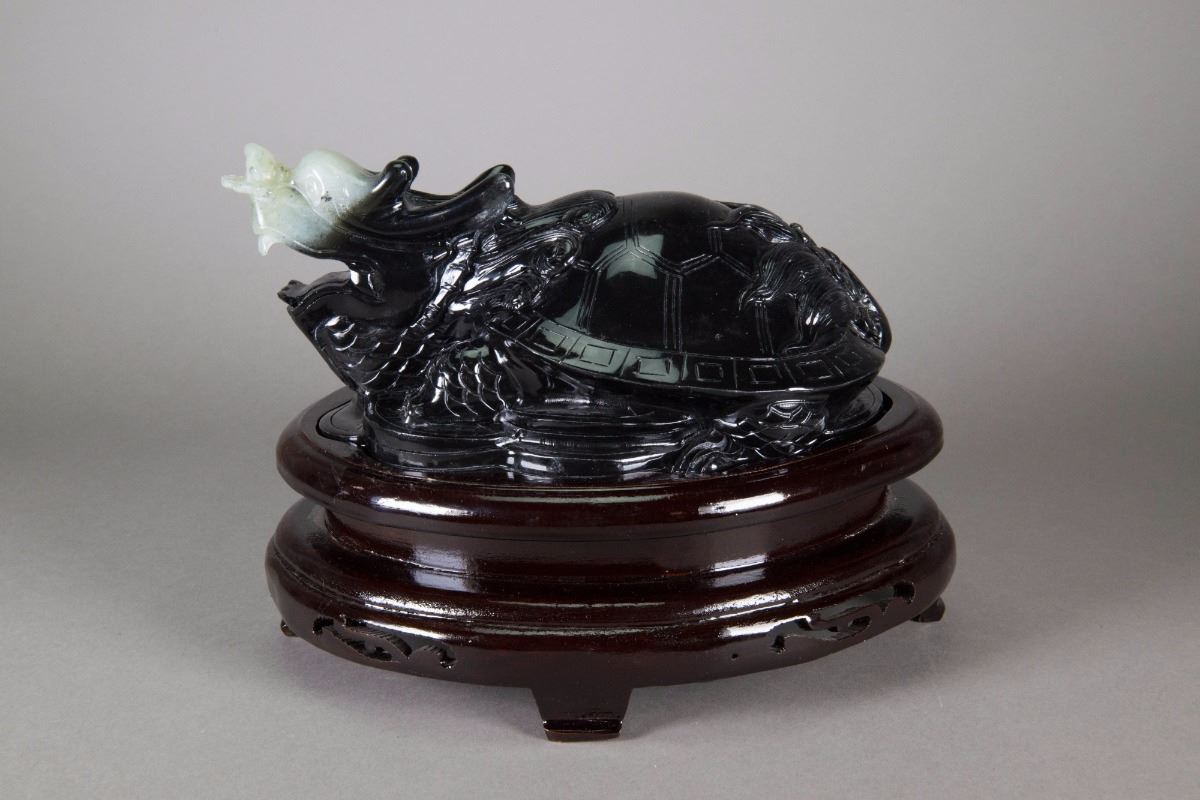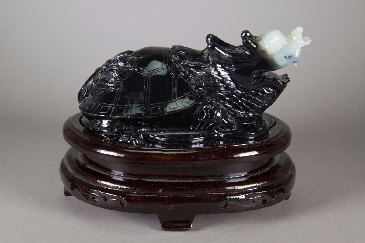 Chinese hardstone carved figure; featuring a turtle with dragon head; of mixed green tone; custom wood stand included; H: 15 cm, W: 24 cm, 3921 grams
