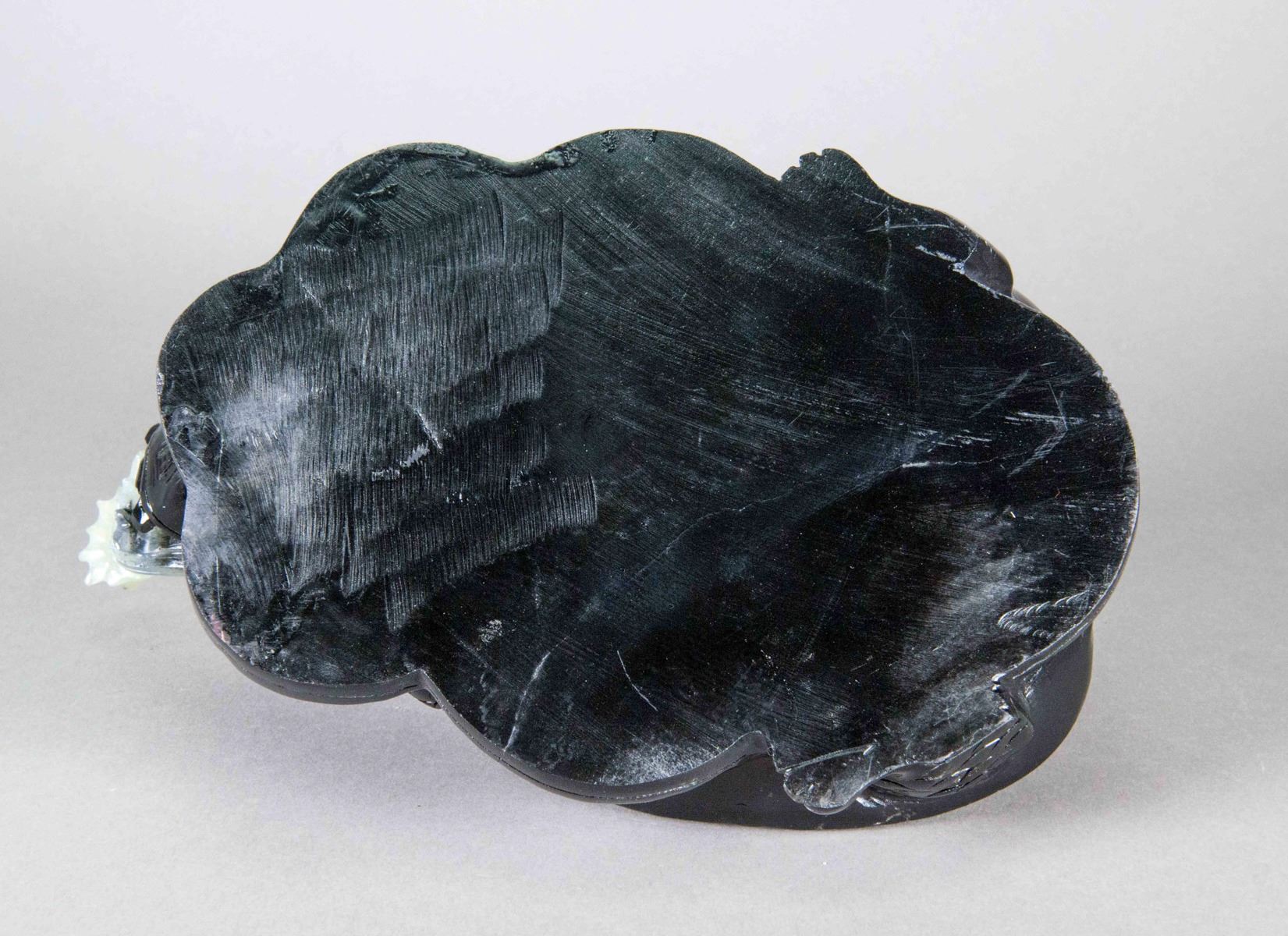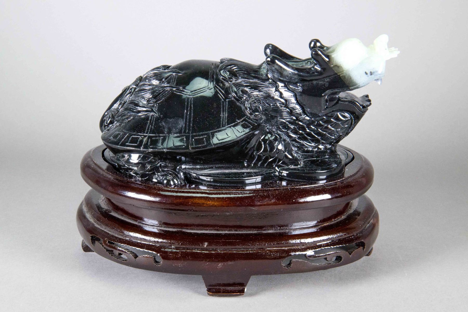 Chinese hardstone carved figure; featuring a turtle with dragon head; of mixed green tone; custom wood stand included; H: 15 cm, W: 24 cm, 3921 grams