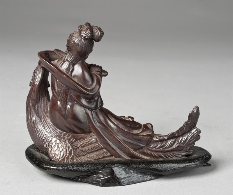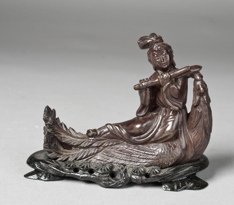 Finely carved to depict a lady on a banana leaf playing the flute, the stone a chocolate brown, probably soapstone, mounted in a fitted carved hardwood stand. 4.5" W x 3.5" H, (not measured with stand). Circa early 20th century.