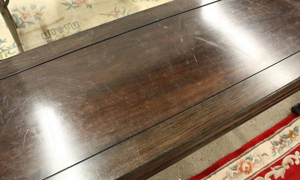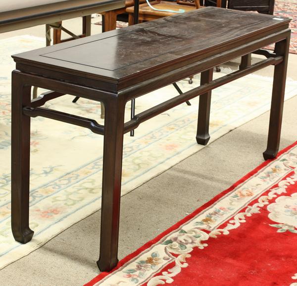 Chinese dark stained hardwood side table, with a rectangular floating top panel and with an ice-plate edge above a simple apron with a beaded-edge continuing on the straight supports with hoof-form terminals and joined by humpback stretchers, 29''h x 60''h x 18''d