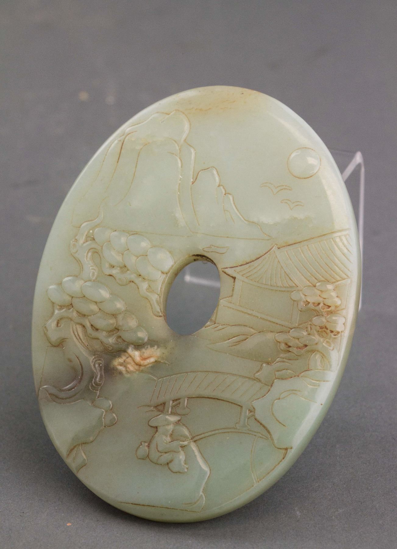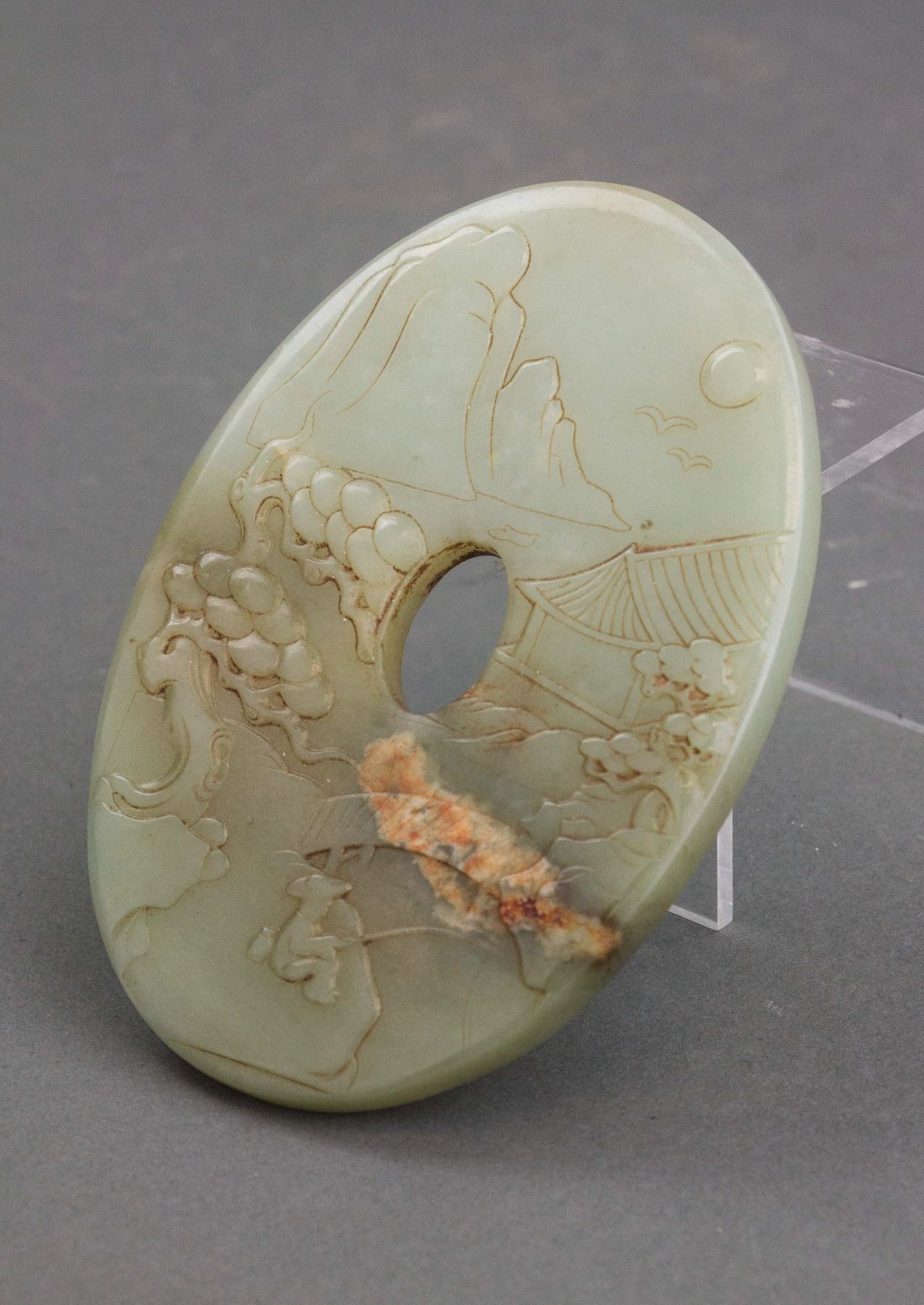 Chinese Hetian green jade carved disk; of round form with a hole in the middle; carved with mountainous landscape and fishing man; of green tone with russet skin; 8 cm x 11 cm, 146 grams, Density: 2.92