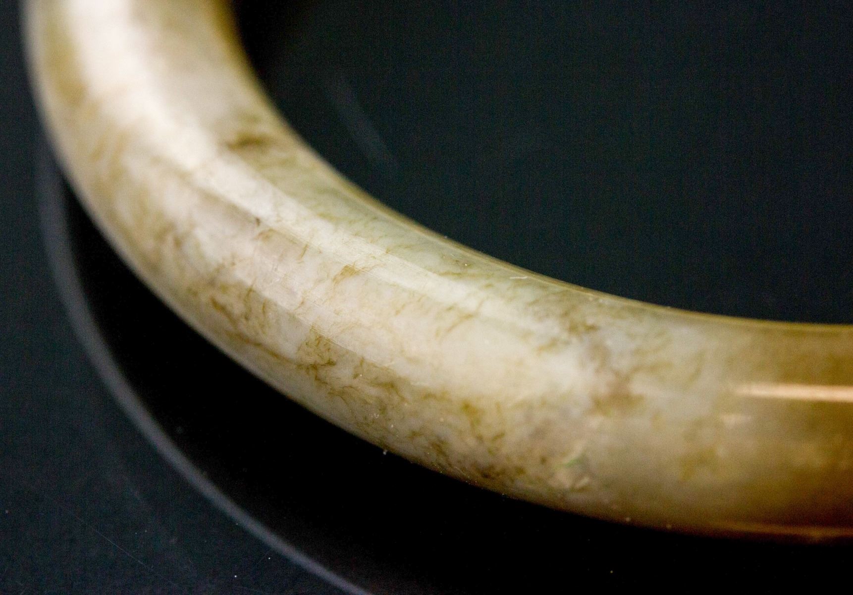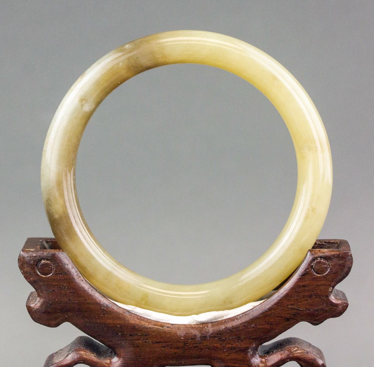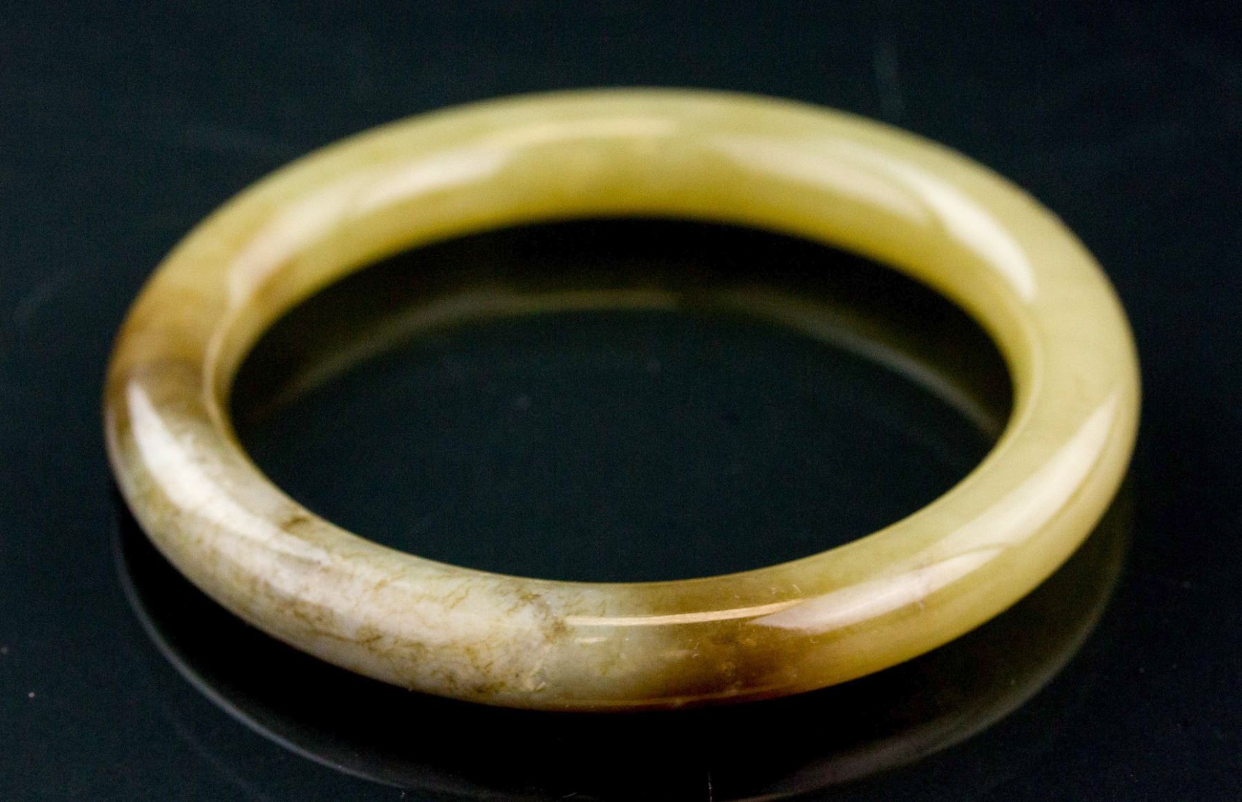 Chinese Heitan jade carved bangle; of rounded outside and inside; of brownish tone; D: 5.3 cm, W: 0.8 cm, 30 grams, Density: 2.93