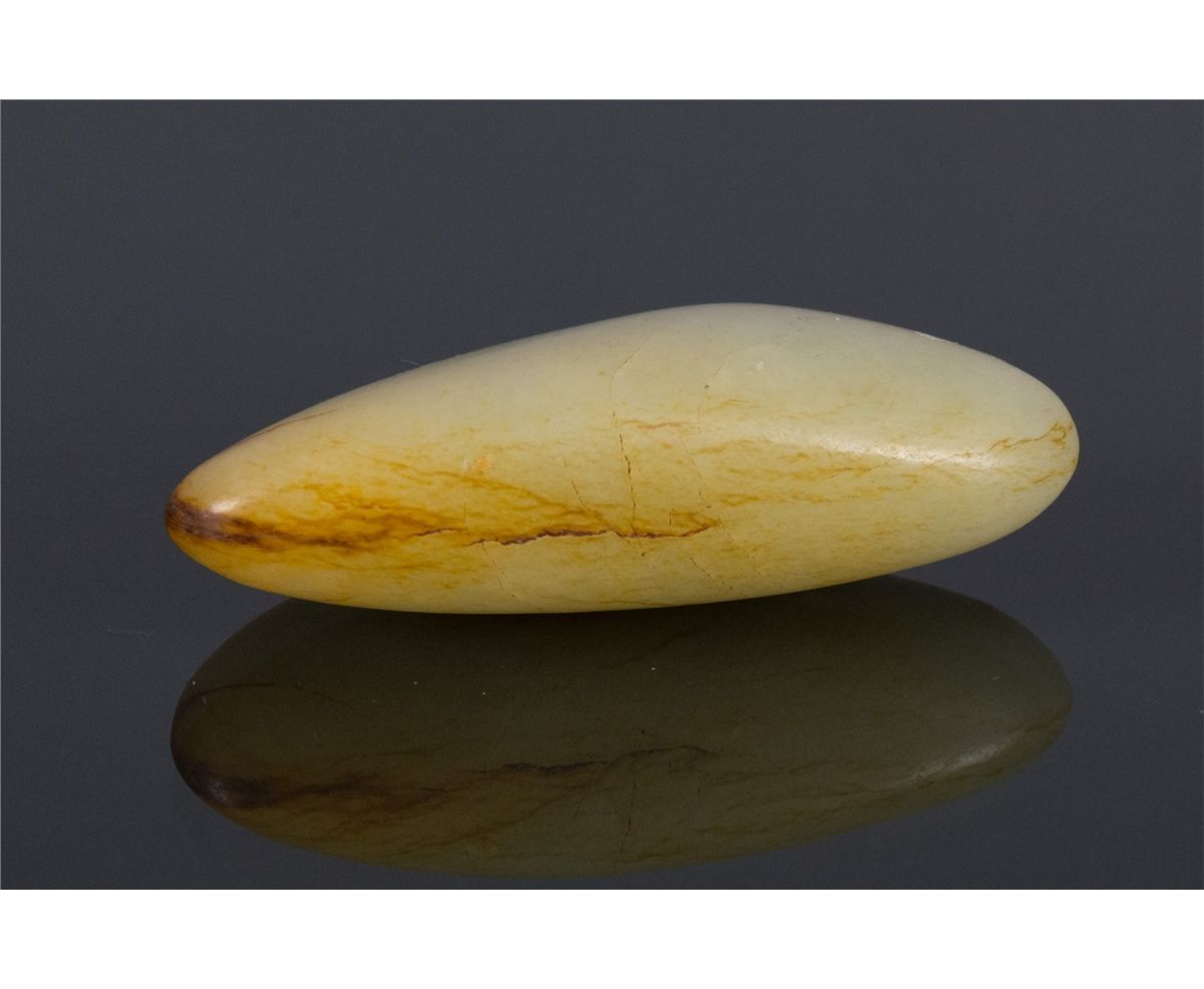 Chinese Hetian jade carved pebble boulder; of translucent white tone with mutton fat suffusions; H: 7 cm, W: 3 cm, 73 grams; Density: 2.95