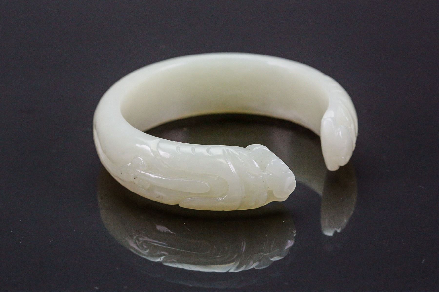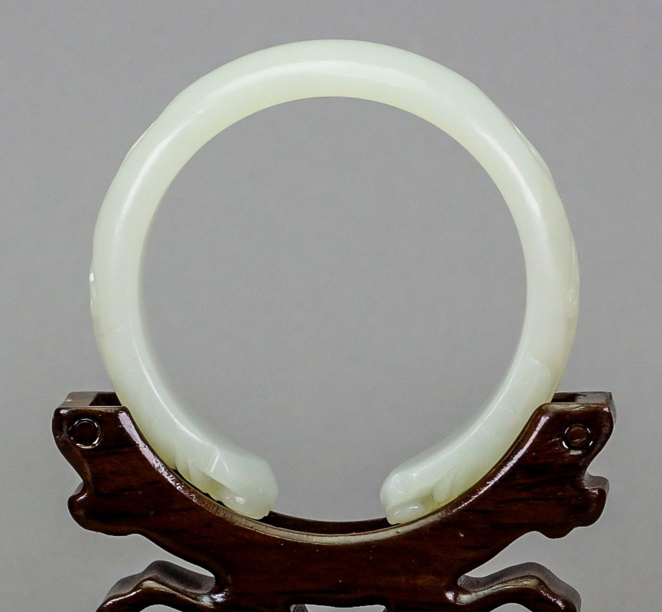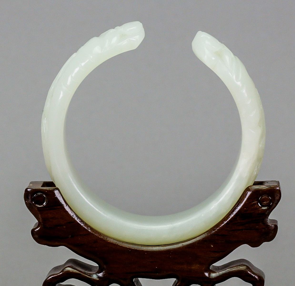 Fine Chinese Hetian white jade bangle; of even tone; semi-rounded edge with fine polish; ends carved with pair of antithetical dragons; wooden stand not included; D: 6.5 cm, inner: 5.5 cm, 55 grams