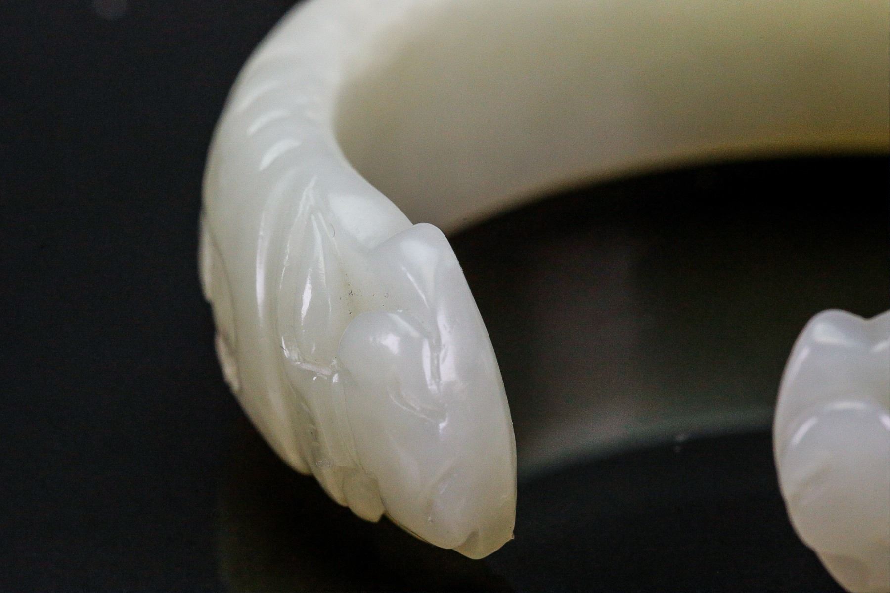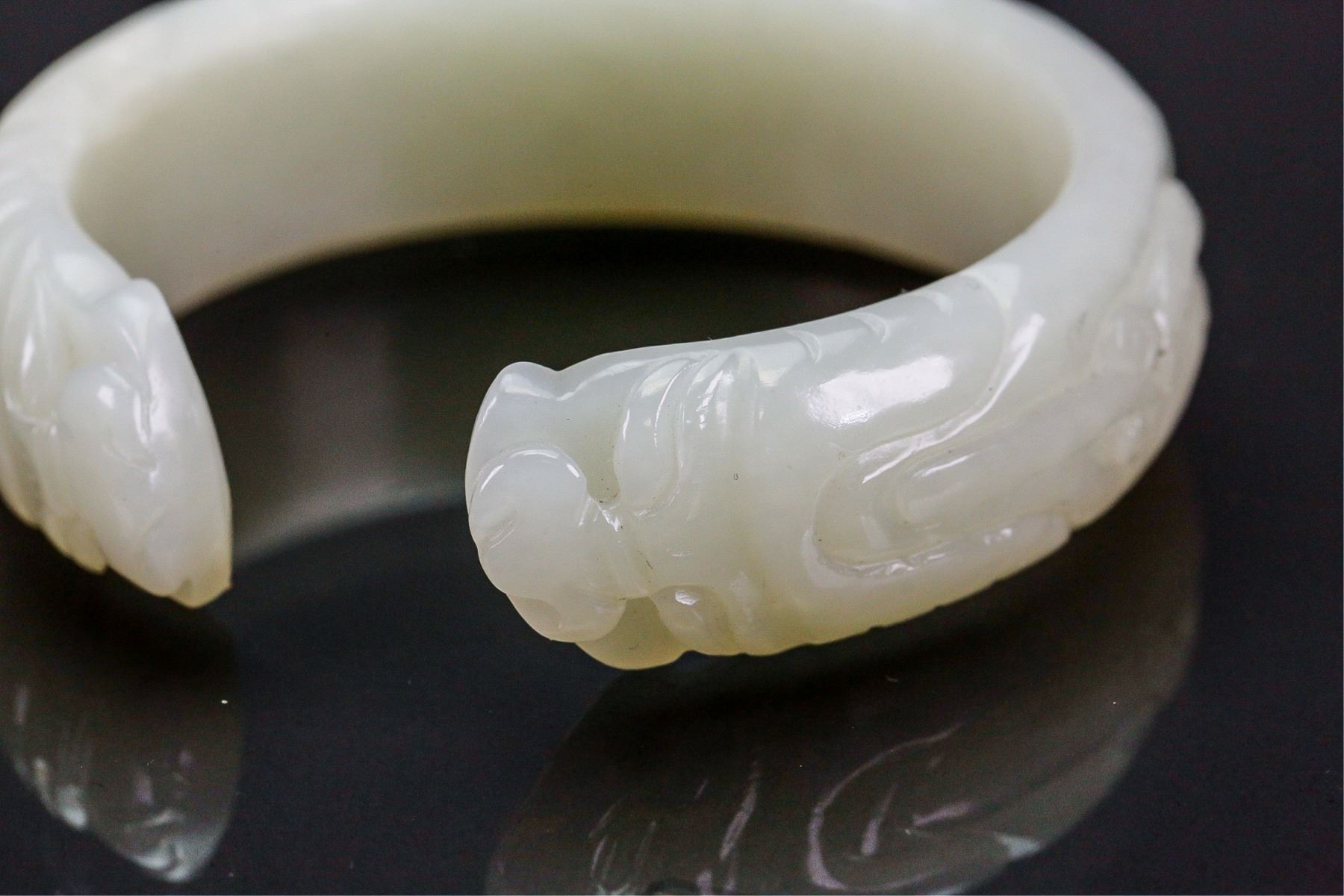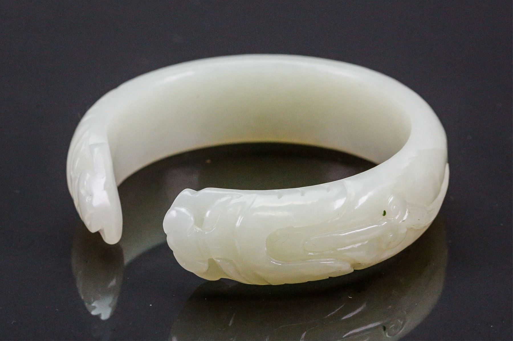 Fine Chinese Hetian white jade bangle; of even tone; semi-rounded edge with fine polish; ends carved with pair of antithetical dragons; wooden stand not included; D: 6.5 cm, inner: 5.5 cm, 55 grams