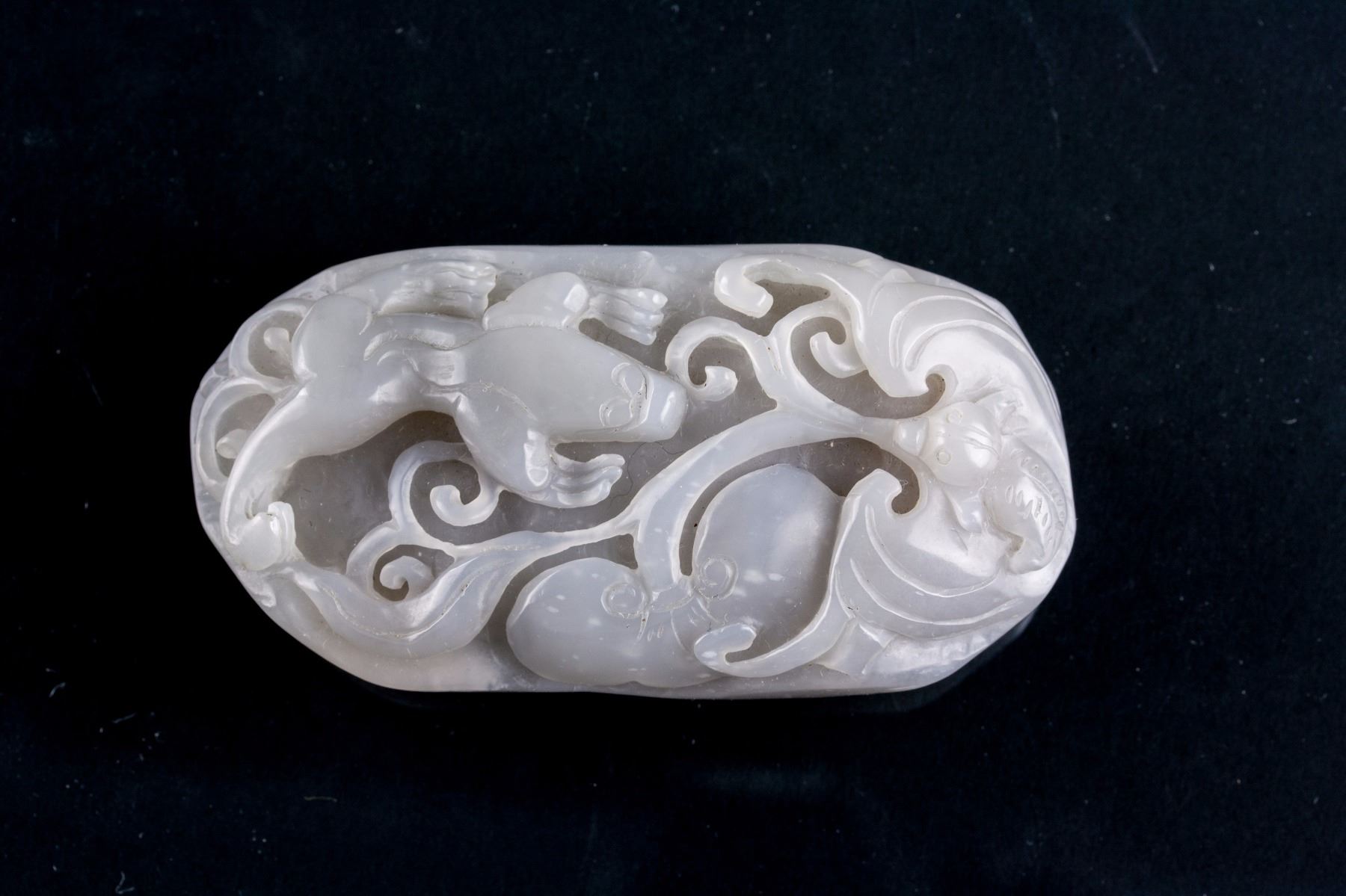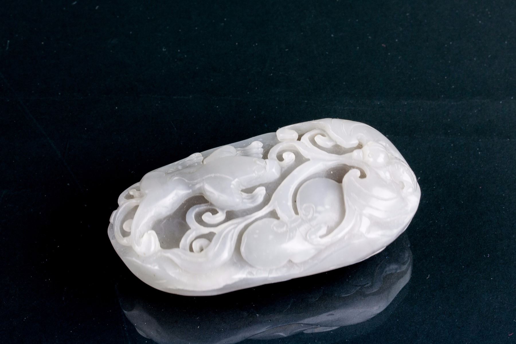 Chinese Hetian white jade carved toggle; carved with lotus flower, beast and bat; of white tone; 9 cm x 4.5 cm, 187 grams, Density: 2.93