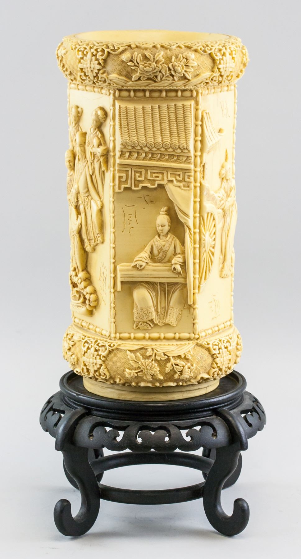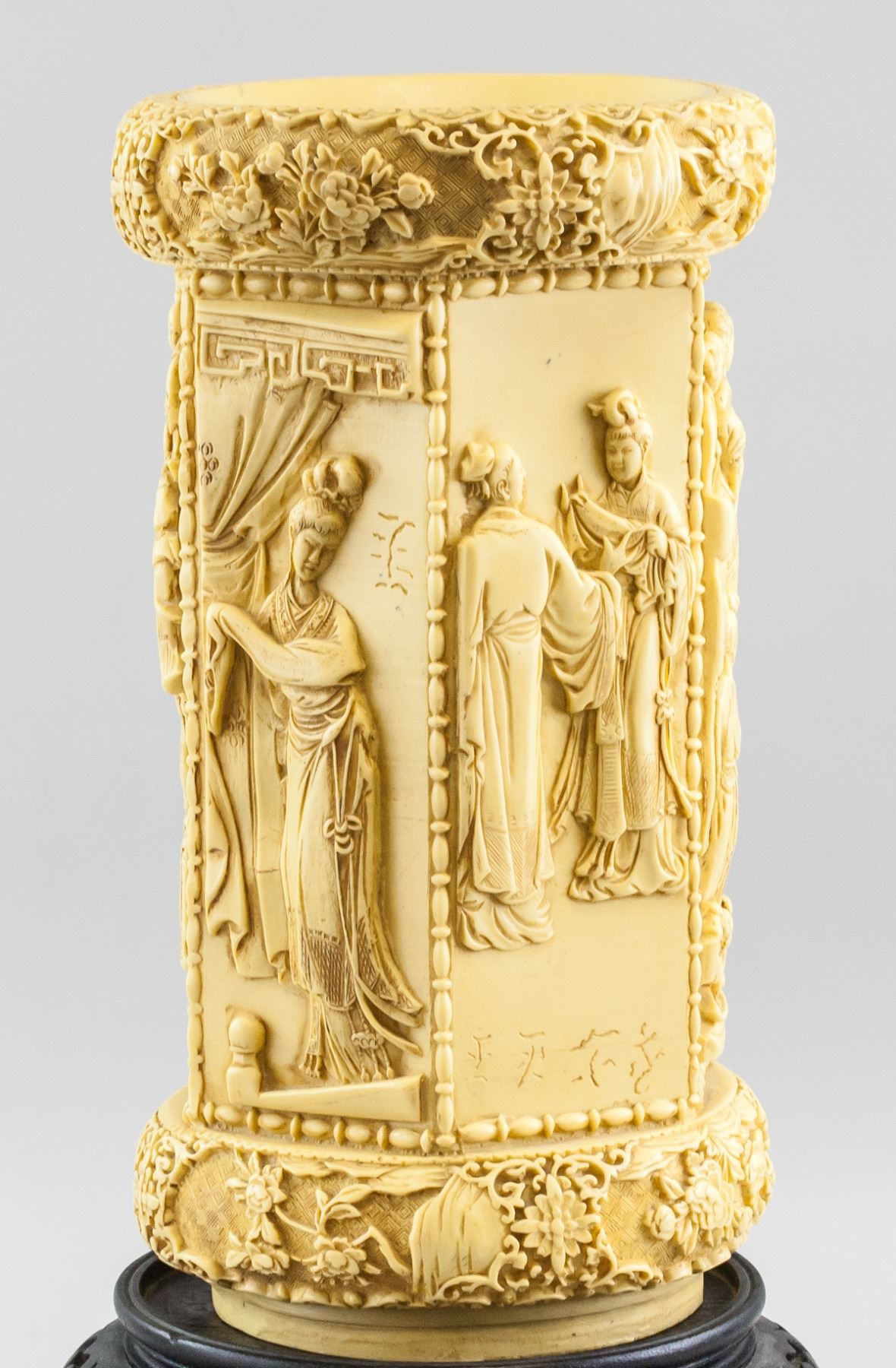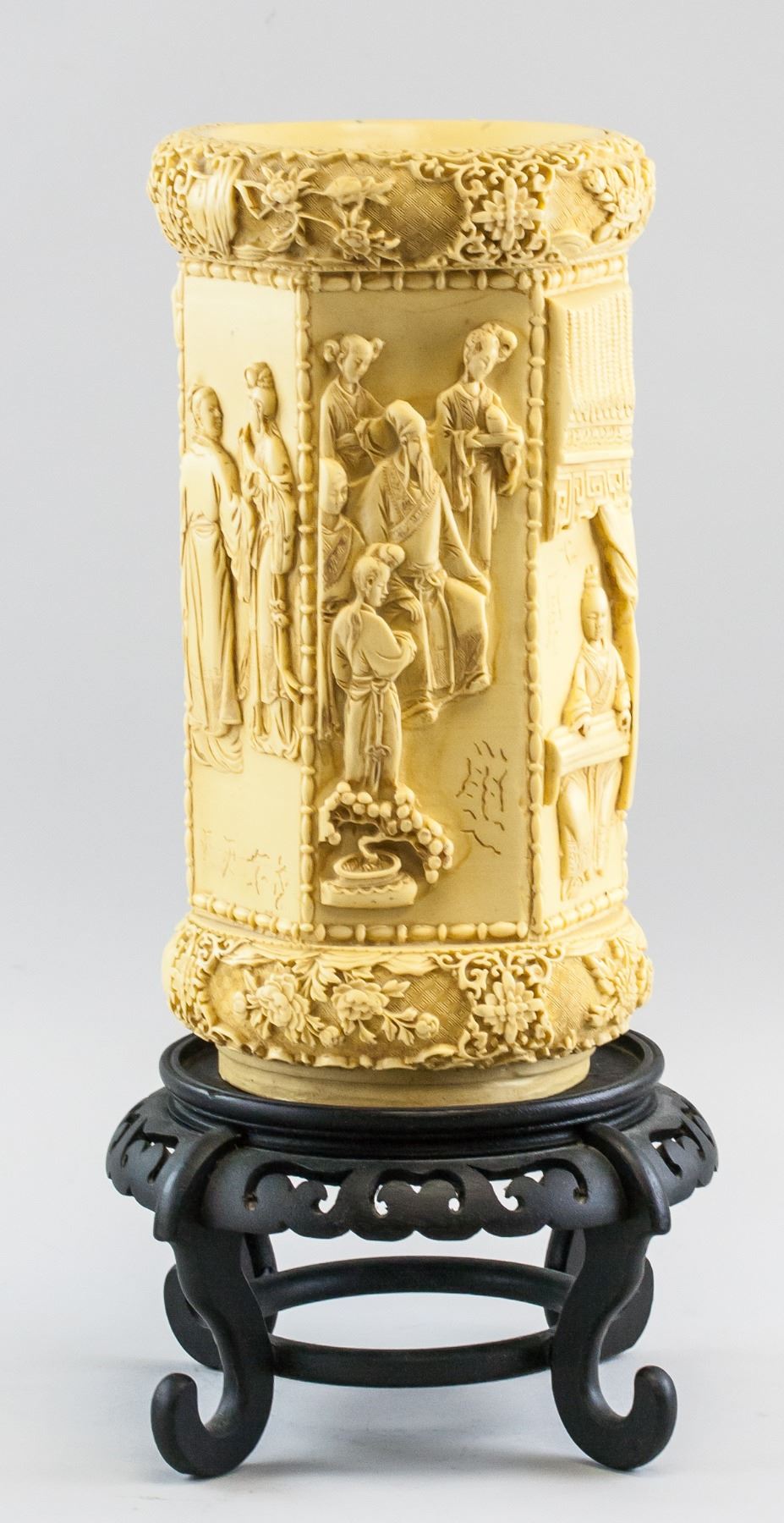 Chinese hexagonal stone/resin brushpot. Carved with figures. With wood stand. 36 x 20 cm, Stand: 15 x 26 cm, Total: 7 kg